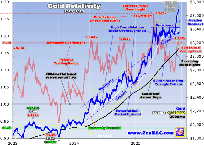 Most technical analysis focuses on the blue gold-price line, which doesn't offer many clues about how overbought gold is. Gold can be low compared to recent years and still hit extreme overboughtness, or high and yet not-particularly-overbought at all. But looking at gold as a multiple of its 200dma baseline brings into sharp focus how far and fast it has run. The red rGold line reveals this bull's overboughtness. Over these last couple years, gold has become pretty stretched technically four separate times. The first three all halted this mighty bull's upward progress, requiring some selling and grinding to rebalance both excessive technicals and sentiment. There's no reason to expect this latest fourth to play out differently. Gold has rallied too far too fast to be sustainable in recent weeks, dramatically upping odds for a breather. The first time gold soared to extremely-overbought levels in this bull was back in mid-April 2024. Gold blasted up 16.9% in just over six weeks, catapulting it way up to 1.188x its 200dma! That proved the highest rGold read in 3.7 years, since just after gold's previous 40%+ monster upleg crested back in early August 2020. I warned about gold's extreme overboughtness at the time in an essay right as gold was peaking. Gold's $2,388 absolute levels didn't matter much then, but surging there so darned fast required some kind of pause. Extreme overboughtness can be worked off two ways, more quickly through fairly-big-and-sharp selloffs or more gradually through sideways-grinding high consolidations. As a speculator I much prefer the faster former since it brings trading opportunities sooner. Eat the broccoli before getting to steak. But in spring 2024 gold consolidated high instead of correcting. Selloffs are classified based on their sizes. Under 10% they are pullbacks, above 10% they are corrections, and over 20% they become bear markets. Despite mid-April 2024's extreme overboughtness, gold only pulled back 4.0% into late April. Surprisingly next it surged to more record highs in mid-May, but then suffered another 5.7% pullback into early June. Overall that made for the sideways drift evident in this chart. Notice that gave gold's 200dma in black time to start catching up with stretched gold price levels in blue. That high consolidation nicely working off overboughtness is readily evident in the red rGold line meandering lower in spring 2024. From mid-April to late June, rGold retreated from that risky 1.188x back to just 1.088x. Much overboughtness was worked off. That healthy rebalancing selling and drifting primed gold's bull for another run higher, which happened into late October 2024. Then gold crested at $2,786 less than a week before Election Day, stretched up a similar 1.183x its 200dma. I wrote another essay earlier that month explaining why gold's selloff risk was high since it was so extremely-overbought. When prices run too far too fast per their own precedent, rallies stall. Indeed not surprisingly since markets are forever-cyclical, gold sold off fairly hard into mid-November with a correction-challenging 8.0% pullback. That was still fairly-mild considering gold had soared a colossal 35.0% YTD at that point! Yet after that selloff, gold's price action morphed into another high consolidation into late December 2024. Gold didn't carve new selloff lows, but drifted back down towards mid-November's. From late October to late December, gold's overboughtness shrunk from 1.183x to just 1.053x in rGold terms. Such essential rebalancings extend bulls' longevities. The biggest risk factor for strong bulls is prematurely burning themselves out. If they soar too far too fast attracting in all-available near-term buyers too soon, that leaves only sellers. And they come out in droves after parabolic blowoffs, slaying bulls. At that point gold's mighty cyclical bull had operated within a tight extreme-overboughtness profile. Twice it peaked at 1.188x and 1.183x gold's 200dma, right where gold again closed this Tuesday at 1.185x. As gold stretching 18%+ above that key technical baseline two previous times forced pullbacks and drifts, today's extreme overboughtness ought to follow that script. Gold again needs to sell off sizably or consolidate. But then in late-April 2025, gold didn't stall at 18%+. In just under six weeks, gold soared 18.5% to a new record $3,421. Gold had so much upside momentum it didn't stop until an astounding 1.266x its 200dma! Those were dangerous crazy-overbought levels, as I warned in another essay that very week. That was so wild I did a study of every gold bull and bear, and every upleg and correction, since way back in January 1971. It turned out gold soaring 26%+ above its 200dma was exceedingly-rarefied territory. That proved the most overbought gold had been since late August 2011, a whopping 13.7 years earlier! And that was just gold's third trading day stretched to 1.26x+ since January 2011. Gold's historical action over the last 54+ years argued a sharp correction was highly-probable, so we battened down the hatches on our gold-stock trades. Excluding the unique 1970s superbulls after the US dollar was severed from gold, the next-ten-largest gold bulls of modern times averaged 58.0% gains over 13.9 months. They peaked at an average of 1.265x gold's 200dma, exactly where it was in late April! Those were followed by average corrections of 15.5% over just 1.9 months! A similar one would've slammed gold back near $2,891 by mid-to-late June. So we ratcheted up the trailing stop losses on our extensive newsletter gold-stock trades, in order to preserve more of their big gains if gold rolled over into a correction. I changed my short-term gold bias to short, and we added some GLD put options. The first correction of gold's mighty cyclical bull was highly likely to unfold soon. The more extreme overboughtness mounts, the greater the near-term risks for big selloffs. While that 1.266x rGold was crazy and far over the 1.18x thresho