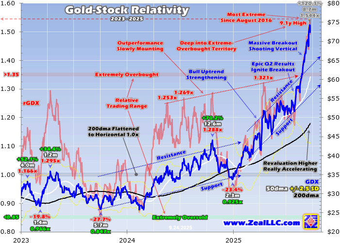Gold stocks' rocket-like ascent since mid-July sure stands out here. They have soared in a massive breakout rally shooting vertical. That has stretched GDX an extreme and quite-precarious 54.4% above its 200dma as of Monday! Such rGDX levels are exceedingly-rarefied territory running way back to its birth in mid-May 2006. Starting 200 days later when its 200dma first formed, GDX has had 4,670 trading days since. Throughout that entire lifespan, GDX has closed 54%+ above its 200dma on only 20 of them. So in hard empirical terms, this leading gold-stock benchmark just soared to top-0.4% levels of overboughtness! While gold stocks have rarely gotten here before, such extremes never lasted long. The last episode is a good case in point. GDX hasn't been so overbought since way back in early August 2016, fully 9.1 years ago. That situation was remarkably analogous to today's. Starting in late May that year, GDX soared 40.6% in just 2.2 months. The catalyst was an underlying big 12.5% gold surge, which GDX amplified by a great 3.3x. That catapulted this dominant gold-stock ETF way up to 1.567x its 200dma. Interestingly fully 16 of GDX's 20 trading days closing 54%+ above its 200dma happened within roughly a month of that episode! The major gold miners' fundamentals were quite strong back then, as evident in their Q2'16 results which I analyzed at the time. There was no reason they needed to sell off other than just experiencing extreme overboughtness. Normally gold-stock price action simply leverages gold's, and gold itself wasn't super-overbought and didn't need to correct. When GDX peaked in early August 2016, rGold was merely 1.134x. We'll circle back to gold overboughtness shortly. Over the next month or so, gold sold off 4.0% which was pretty mild. Normally that wouldn't be enough to spook gold-stock traders. Yet because GDX had just blasted to such extraordinarily-overbought levels, gold stocks dropped hard. Over that same one-month span, GDX plunged 18.6% amplifying gold's downside by a brutal 4.6x! That was a real kick in the teeth. Gold stocks didn't need to correct fundamentally, but they still fell precipitously out of super-overbought extremes. Whenever prices run so far so fast that they shoot vertical, those gains are usually followed by a symmetrical collapse. That doesn't erase all the rapid gains, but often the large majority. In that August-2016 episode, GDX retraced 64% of its preceding surge! Reckonings always follow extreme overboughtness. The driving psychological dynamics are easy to understand. When prices rally too far too fast, they attract in all-available buyers too soon. As prices soar, so does herd greed motivating traders to rush to chase those rapidly-accruing gains. But once near-term buying firepower is exhausted, that leaves only sellers. They are quick to flee once gold stocks start retreating, and that selling soon mounts then cascades. Just like surging gold stocks make traders want to buy more, plunging gold stocks quickly scare them into dumping more. By the time the dust settles in a month or two, GDX has collapsed in a sharp inverted-V shape. Soaring too far too fast is never sustainable, and usually ends this way. Extreme overboughtness and extreme greed have to be rebalanced away by subsequent selloffs, restoring sustainable norms. Fast-forward to today, and GDX again just skyrocketed 45.4% in only 2.2 months leaving it stretched a whopping 54.4% above its 200dma! Making matters worse, gold is much more overbought now than it was in early August 2016. This week gold blasted up to 19.8% above its own 200dma. Last week I wrote a whole essay on gold being pretty stretched technically, analyzing its current overboughtness and implications. Gold has remarkably evaded corrections in its mighty bull since early October 2023, which grew to a jaw-dropping 106.8% mid-week! Gold has yet to see a single 10%+ correction in this entire span! Instead of big-and-sharp corrections after its own extreme-overbought episodes in these last couple years, gold has instead drifted sideways. High consolidations also rebalance technicals and sentiment, but much more slowly. Gold's pullbacks within these drifts have still run between 4% to 8% bull-to-date. It is highly-probable gold will soon experience another selloff of at least this magnitude, and it could be bigger. If gold retreats say 6% and GDX amplifies that by 4x which is common when gold selloffs scare gold-stock traders, we could be staring down the barrel of a 25%ish drawdown in gold stocks! That implies GDX falling back under $56. As evident on this chart, that would reverse about 4/5ths of gold stocks' recent blistering surge. At about 2/3rds like that last similar super-overbought episode in early August 2016, GDX would drop under $59. Such big retracements likely to unfold rapidly over a month or two would eliminate GDX overboughtness and eradicate herd greed, leaving this sector rebalanced. Such periodic healthy selloffs are inevitable in bulls. If you are ready for these psychologically, they spawn excellent opportunities. Ratcheting up stop losses before them in extreme overboughtness preserves more big unrealized gains as selloffs unfold. To give some context, we last aggressively added new fundamentally-superior smaller mid-tier and junior gold-stock trades in our subscription newsletters from late June to late July. That was mostly before this latest surge. As of midweek, our unrealized gains on these young trades are running as high as +97%! I'm hesitant to sell outright because gold stocks and gold can grow more overbought still if a popular speculative mania erupts, but I don't want to risk such big gains. So tightening stops protects more of them while letting us stay deployed just in case. Any stoppings yield capital we will use to refill our trading books as GDX bottoms. Over the past quarter-century-plus I've written plenty of these essays warning of imminent gold and gold-stock selloffs due to extr