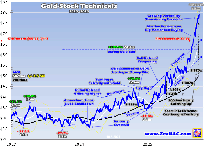 After a quarterly-century actively trading gold stocks, this chart makes me really nervous. GDX has soared a frightening 57% above its 200-day moving average this week! In the entire history of this leading gold-stock benchmark since its 200dma was first established in early-March 2007, GDX has closed 57%+ over on just 11 trading days or 0.2% of all of them! We are in dangerous wildly-rarefied territory here. Fully 8 of those exceedingly-overbought days came in July 2016. That episode didn't end well for gold stocks, with GDX plunging 39.4% over the next 4.4 months into mid-December on a parallel 17.2% gold selloff! The major gold stocks of GDX tend to amplify material gold moves by 2x to 3x. And gold itself is crazy-overbought today, arguing it faces a big-and-fast 10%+ correction-grade selloff in coming months. Such extreme technicals are overwhelmingly short-term-bearish for gold stocks, there's no doubt. But once they suffer a rebalancing selloff, they can resume powering much higher. Since early October 2023 when gold's mighty bull started galloping, GDX has soared 205.5%. But if that Q3'25 implied-unit-earnings estimate of $1,959 is in the ballpark, GDX-top-25 sector profits have soared 188.2% in that span! So gold stocks have merely paced their profits growth, largely maintaining similar low valuations to what they suffered back in Q4'23 when GDX averaged just $29.26! Even in conventional trailing-twelve-month price-to-earnings-ratio terms, plenty of gold miners are still trading in the teens or even single-digits! Gold stocks are far from overvalued, and mounting investor enthusiasm drives huge overvaluation late in bulls. Considered another way, gold's huge bull run which is also a single monster upleg yet to see any 10%+ corrections has soared 122.1% at best since early October 2023. GDX leveraging that by its historical norm of 2x to 3x would make for a 244%-to-366% gold-stock bull so far. Yet again GDX has merely climbed 205% at best in these last couple years. Gold stocks remain well behind gold with lots of rallying left to do. Overboughtness is normal in bulls, which take two steps forward before one step back. And gold-stock technicals mirror and amplify gold's, meaning GDX suffers periodic selloffs with its metal. So pullbacks and corrections are par for the course in bulls, perfectly normal and healthy. Just because gold and its miners' stocks are due for another rebalancing selloff now certainly doesn't mean their bull runs are over. Far from being threats, periodic mid-bull selloffs are great opportunities for speculators and investors. Their resulting lower prices offer the best mid-bull entry points for adding new positions. While our newsletter trading books are currently full of huge unrealized gains running as high as +106% on young gold-stock trades we added from late June to late July, I'm looking forward to buying more after this next selloff. Ideally it would unfold rapidly before Q3 earnings season hits full-swing in early November, but no one can know the timing and depth in advance. With fund managers getting interested in gold and gold stocks for the first time in many years, the miners' epic record Q3 results could spark sizable-to-big buying. But if this overdue selloff tarries and hits during earnings releases, their psychological impact would be muted. Regardless if gold stocks keep surging or instead plunge sharply from here, the gold miners' fundamentals continue to improve. They've been incredibly strong for eight quarters in a row now, and Q3'25 will prove the ninth. And actively trading gold stocks has been very profitable for far longer than that. Since 2001 our pair of subscription newsletters have realized 1,601 total stock trades as of Q3'25, mostly gold miners. Their average annualized realized gains across that quarter-century span, including all bears and all losing trades, is running +18.2%! Professional money managers know that is a tremendous world-class track record, roughly doubling stock markets' long-term average! Our average is going to climb after we realize massive gains on about 20 more open gold-stock trades still on our books. The getting is really good. Successful trading demands always staying informed on markets, to understand opportunities as they arise. We can help! For decades we've published popular weekly and monthly newsletters focused on contrarian speculation and investment. They draw on my vast experience, knowledge, wisdom, and ongoing research to explain what's going on in the markets, why, and how to trade them with specific stocks. Our holistic integrated contrarian approach has proven very successful, and you can reap the benefits for only $10 an issue. We extensively research gold and silver miners to find cheap fundamentally-superior mid-tiers and juniors with outsized upside potential. Sign up for free e-mail notifications when we publish new content. Even better, subscribe today to our acclaimed newsletters and start growing smarter and richer! The bottom line is more gold-miner records are coming in Q3's results. Dazzling record average gold prices last quarter combined with far-slower-rising mining costs are going to yield fantastic record implied unit earnings for gold miners. Those are likely to almost double year-over-year, making for the ninth quarter in a row of colossal market-leading earnings growth. Fund investors should again take notice of this. But gold miners' strongest fundamentals ever are clashing with exceedingly-overbought prices today. Their own history argues they've rallied too far too fast to be sustainable, meaning big-and-fast selloffs are overdue. But after those rebalance super-stretched technicals and sentiment, gold miners' epic fundamentals still support much-higher price levels in coming years. Q3's earnings season will prove phenomenal. ### Oct 10, 2025 Thoughts, comments, or flames? Fire away at zelotes@zealllc.com. Due to my staggering and perpetually increasing e-mail loa