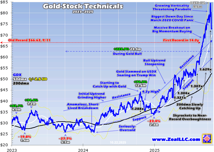 Gold Stocks SlammedAdam Hamilton Gold miners' stocks were just slammed sharply lower as high-flying gold started wobbling. Gold stocks' great leverage to gold is a double-edged sword, amplifying rallies and selloffs alike. These serious blows suffered by gold stocks have given traders pause, leaving them wondering if this was a temporary blip or harbinger of a much-bigger drawdown. As always, gold stocks' near-term fortunes depend on their metal's. Late last week, the leading GDX gold-stock ETF soared to another dazzling all-time-record-high close of $84.44. GDX had skyrocketed an epic 149.0% year-to-date on a parallel massive 64.5% gold surge! That's wonderful to see, a magnificent reversal from gold stocks' dreadful underperformance last year. In 2024 GDX only eked out a 9.4% gain despite gold's powerful 27.2% rally, for horrendous 0.3x upside leverage. Normally the major gold miners dominating GDX amplify material gold moves by 2x to 3x, with YTD 2025 running 2.3x at that latest gold-stock peak. Back in early January, my first essay of 2025 was called Gold Stocks' Revaluation Year. With gold stocks deeply out of favor near major lows, I concluded "2025 has great potential for gold stocks to enjoy a major-paradigm-shift revaluation higher. Gold just experienced one..." Fully expecting gold stocks to way outperform their metal, our newsletter subscribers have realized many massive gains on gold-stock trades this year. Yet just in this last month or so, gold and its miners' stocks have grown seriously-overheated. More speculators and investors have increasingly flooded in to chase their phenomenal upside, quickly forcing both sector technicals and sentiment to unsustainable extremes. So we tightened the trailing stop losses on all our open newsletter trades in anticipation of the necessary and inevitable rebalancing selloff. In late September I wrote an essay GDX Super-Overbought warning of the serious downside risks in gold stocks. At that point GDX had stretched an extreme 54.4% above its baseline 200-day moving average, a key measure of overboughtness. That would soon grow even worse. Last Thursday when GDX hit that latest $84.44 record, it had soared 62.9% above its 200dma! This was exceedingly-rarefied territory, far beyond extreme. GDX was the first real gold-stock ETF, born way back in mid-May 2006 fully 19.4 years ago. It quickly became the gold-stock benchmark of choice for traders. Its 200dma was first established in mid-March 2007. GDX's recent overboughtness challenged records. That 1.629x-its-200dma close last Thursday ranked as its third-highest ever! Only two days in early July 2016 were slightly more extreme at 1.646x and 1.630x. So one more day of rallying would've just catapulted gold stocks to their most-overbought-ever in GDX's multi-decade lifespan. Gold stocks had rarely been more overbought before March 2007 in their earlier HUI and XAU indexes, but last week was exceptional. Compounding the downside risks for gold stocks at such crazy extremes, gold was also exceedingly-overbought. That day GDX crested, gold had soared 32.7% above its own 200dma! Gold's mighty cyclical bull had grown into its biggest ever, as I analyzed in depth in a popular essay last week. That proved gold's eighth-highest overboughtness episode on record since 1971, when the dollar was severed from gold! Based on their own historical precedents, both gold and its miners' stocks had soared way too far too fast to be sustainable. That didn't mean they couldn't rally more yet on traders flocking to chase, but the more overbought they grew the more their downside risks shot up. High-flying gold finally started wobbling last Friday, falling 1.9% in its worst down day since mid-May. All that selling came early on and wasn't news-driven. That definitely spooked gold-stock traders, who hammered GDX 6.8% lower on close. That was also its worst down day since mid-May, and ranked as 47th largest in GDX's entire history or top 1.0%! That day gold stocks' downside leverage to gold soared to 3.5x, which isn't unusual. When gold drops enough to scare traders, gold stocks tend to suffer disproportionately. Holding them when gold is falling is really risky. Gold immediately recovered from that wobble this Monday, soaring 2.8% to another record $4,350 which was 33.0% above its 200dma! Weekend reports of silver shortages in India looked to fuel big overnight buying in Asia and Europe. But concerningly gold-stock traders didn't rush back, GDX merely climbed 2.1% for ugly 0.7x upside leverage. Friday's sharp plunge had apparently damaged greedy herd sentiment. Then this Tuesday, things got really nasty. Gold was pummeled overseas heading into the US session, with no apparent news catalyst. By the time the dust settled, gold had plummeted 5.3% in that single day! That was its biggest daily drop in 5.2 years, and shockingly one of its largest ever. It clocked in as gold's 39th-largest daily loss since January 1971, making it top-0.28% across that vast 54.8-year span of time! Gold certainly wasn't low at that $4,120 close, levels it had first seen just five trading days earlier. But gold-stock traders wilted, slamming GDX a massive 9.4% lower that day! That stopped us out of almost all of our newsletter gold-stock trades, with good-to-huge realized gains thanks to our ratcheted-up stop losses. GDX's pummeling made for its worst down day since in March 2020's COVID-lockdown stock panic. That also proved GDX's 14th-biggest daily drop in its entire history, ranking as top-0.29% which was remarkably close to gold! There was a silver lining though, as GDX merely leveraged gold by a mild 1.8x on that carnage-ridden day. At its usual 2x to 3x, GDX would've plummeted 10.6% to 15.9%! GDX has suffered three 15%+ daily crashes in its history, so they aren't unheard of. But 9.4% was still super-ugly. By Wednesday's data cutoff for this essay, gold's total drawdown grew to 5.7% over two trading days while GDX's extended to 13.8% o