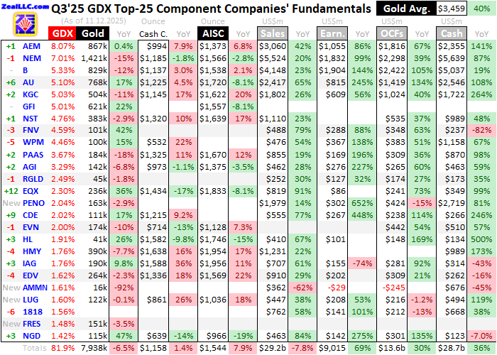 Gold Miners' Q3'25 FundamentalsAdam Hamilton Gold miners' Q3 earnings season just wrapped up, and the majors' results proved spectacular. And they really needed to be, to fundamentally justify gold stocks' monster bull run this year. Gold miners are earning money hand-over-fist in this lofty gold-price environment, achieving many all-time records. Their massive profits consistently skyrocketing for over a couple years now still warrant big future gold-stock gains. The GDX VanEck Gold Miners ETF remains this sector's dominant benchmark. Birthed way back in May 2006, GDX has parlayed its first-mover advantage into an insurmountable lead. Its $23.9b of net assets midweek dwarfed the next-largest similar competitor ETF's by over 9x! GDX is undisputedly the trading vehicle of choice in this sector, with the world's biggest gold miners commanding most of its weighting. Gold-stock tiers are defined by miners' annual production rates in ounces of gold. Small juniors have little sub-300k outputs, medium mid-tiers run 300k to 1,000k, large majors yield over 1,000k, and huge super-majors operate at vast scales exceeding 2,000k. Translated into quarterly terms, these thresholds shake out under 75k, 75k to 250k, 250k+, and 500k+. Those two largest categories account for nearly 44% of GDX. GDX is enjoying a legendary year, skyrocketing 133.9% year-to-date as of midweek! And that's part of a way-larger bull run soaring 225.9% over 24.4 months from early October 2023 to mid-October 2025. With outstanding performance like that, speculators' and investors' interest in this sector has naturally soared. My first essay this year back in early January analyzed why 2025 should prove Gold Stocks' Revaluation Year. But financial markets are rarely linear for long, and gold stocks have always been a volatile sector. So since soaring to extraordinarily-overbought extremes in mid-October, gold stocks were slammed sharply lower. By early November GDX had plunged 19.1% from that peak under three weeks earlier! Gold's historic precedent strongly argues its parallel 9.5% drawdown isn't over, which would force gold stocks lower. So major gold miners' hot-off-the-presses Q3 results are particularly important. How they are actually faring operationally and financially and their resulting valuations really affect their stock prices' potential going forward. Their fundamentals need to be strong enough to both justify 2025's colossal gains and underpin this powerful bull run continuing after gold's healthy drawdown. That should be a good buying opportunity. For 38 quarters in a row now, I've painstakingly analyzed the latest operational and financial results from GDX's 25-largest component stocks. Mostly super-majors, majors, and larger mid-tiers, they dominate this ETF at 81.9% of its total weighting! While digging through quarterlies is a ton of work, understanding the gold miners' latest fundamentals really cuts through the obscuring sentiment fogs shrouding this sector. This table summarizes the operational and financial highlights from the GDX top 25 during Q3'25. These gold miners' stock symbols aren't all US listings, and are preceded by their rankings changes within GDX over this past year. The shuffling in their ETF weightings reflects shifting market caps, which reveal both outperformers and underperformers since Q3'24. Those symbols are followed by their current GDX weightings. Next comes these gold miners' Q3'25 production in ounces, along with their year-over-year changes from the comparable Q3'24. Output is the lifeblood of this industry, with investors generally prizing production growth above everything else. After are the costs of wresting that gold from the bowels of the earth in per-ounce terms, both cash costs and all-in sustaining costs. The latter help illuminate miners' profitability. That's followed by a bunch of hard accounting data reported to securities regulators, quarterly revenues, earnings, operating cash flows, and resulting cash treasuries. Blank data fields mean companies hadn't disclosed that particular data as of the middle of this week. The annual changes aren't included if they would be misleading, like comparing negative numbers or data shifting from positive to negative or vice-versa. Gold miners' earnings and stock prices naturally leverage gold. So with the metal's quarterly-average price soaring an amazing 39.7% YoY in Q3 to a magnificent record $3,459, these latest results had to be fantastic. The major gold miners certainly didn't disappoint, stacking many more records. As I previewed before Q3's earnings season even started, these latest results just had to prove awesome. And they truly did!