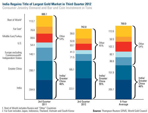 3 Events Worth WatchingBy Frank Holmes Indian Gold Demand Picks Up The love for gold has been reignited in India, according to the World Gold Council (WGC) in its Gold Demand Trends for the third quarter of 2012. India regained its title as the strongest performing market, overtaking the greater China area, as the country experienced a bounceback in demand due to improved sentiment during the festival season. Compared to the third quarter of last year, Indian gold jewelry demand grew by 7 percent while gold bar and coin demand rose 12 percent. Total consumer demand was 223 tons, compared to 205 tons this time last year. The second largest market was Greater China, which consumed 185 tons in the third quarter of 2012. This was less than the 201 tons consumed in the third quarter of last year. Together these markets in the east made up 55 percent of the world’s jewelry and investment demand, according to the WGC.