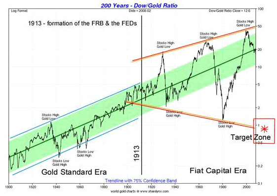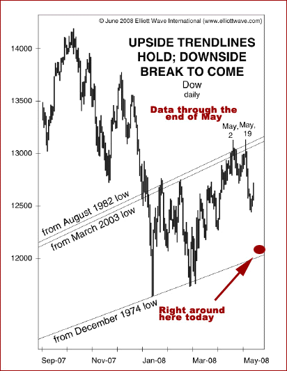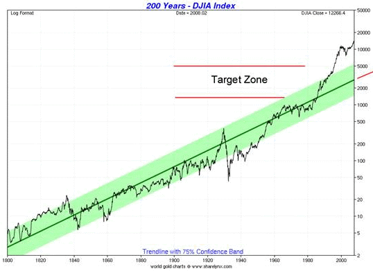 We see that we have demonstrably violated the trend lines for the bull markets for the Dow Jones Industrial Average dating back to 1982 and 2003. It appears likely that we are going to test the trend line for the market dating back to 1974 for the third time this year. The market was unable to sustain a move above the 1982 and 2003 bull market trend lines during the market rebound following the Fed bailout of Bear Stearns on St. Patrick's Day. A violation of the 1974 supporting trend line could spell doom and start a mean reversion which would bring the average below 5000 as the chart provided by sharelynx.com indicates: