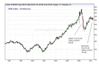 The Chart is TrueHoward S. Katz (Click on image to enlarge) Above is the CRB index, monthly basis, for the past 15 years showing the beginning of the (second) upswing of the commodity pendulum. (This is the real CRB index, the one which was started in 1955 and weighs the different commodities equally, not one of the modern variants which overweigh the energy group.) To an experienced chartist, it is a thing of beauty. Note, for example, the double bottom which formed between 1998 and 2002. That formation has predicted the entire commodity rise we have seen so far this century. And if I had carried the chart back to 1980, then you could see that the late 2008 decline carried almost precisely to the 1980 top at 337, indicating a normal pull back to support (with bullish implications) and not an important top. Think of how much money it was possible to make on the knowledge of this one formation alone. But today I wish to continue my theme that the theory of “deflation” propounded by the media in late 2008 is the main enemy of speculator profits at this time. I have argued that the theory is false a) because there is not the slightest evidence of declining prices and b) because there is enormous evidence of a massive rise in prices to come (perhaps the greatest rise since the depreciation of the American continental from 1776 to 1780). Note, with regard to the first point, I disregard evidence which commits the self-confirming fallacy. This is where people believe a thesis and then act in a way which makes it appear to be true. That is, in the latter half of 2008 the price of commodities went down due to speculators who read in the media that prices were going to go down and sold their commodities. Prices did not go down because of supply and demand. The media can cause any move in any market, usually small, by appealing to the greed and fear of these speculators. However, these moves will be followed by opposite moves, and the speculators who believed in them will lose their shirts. Now when any new theory hits the financial markets, true or false, the markets discount it. Thus, when the “deflation” theory was announced in mid-September 2008, the commodity markets were hit hard (see chart above). But because there was no supply-demand reality behind this theory, the speculators who sold when they heard it took terrible losses, and many of them sold near the bottom. What we have had for the first half of 2010 is a secondary “deflation” scare (see chart). The CRB is up by 40% from its Dec. ’08 bottom. Gold is up by 70% from its Oct. ’08 bottom. Yet the gold community has allowed itself to be shaken by fear. Mark Hulbert had an excellent article a week or so ago in which he pointed out that his gold newsletter sentiment index had dropped to 23.5% bullish (on July 1) from a high of 68% bullish last December. If even the gold bugs, who are the toughest speculators and most skeptical of the media hype, are getting scared, then indeed we are in a period of great fear. And yet, despite this fear look at how little the CRB index has declined since January. Obviously, the media’s ability to scare the speculative community is waning. First, the gullible ones have already sold. (At the double bottom in gold in September-October 2008, there were two massive short squeezes on the bears in gold, as evidenced by the Commitment of Trader report for large speculators. On each squeeze, gold rallied close to $200 in a month’s time. They won’t try that again for a while.) And second, the economic facts are not supporting the theory. It would be perfectly normal for a decline in commodity prices to cause a decline in consumer prices. This is what happened to some extent in the 1980s. The decline in commodity prices resulting from the second downswing of the commodity pendulum was translated into a decline (or a moderation of the rise) in consumer prices. For example, in 1986 crude oil fell to $10 per bbl (from $40 in 1981), and this led to a decline in the price of gas-at-the-pump below 80¢ per gallon. In the larger scope, the commodity decline of 1980-1999 moderated the increase in the Consumer Price Index and allowed the Republicans of that era (Reagan, Bush, Sr.) to get away with massive printing of money. Now (since 2001), however, we are on the upswing of the commodity pendulum. The “deflation” scare of 2008 can delay but cannot prevent the massive increase in consumer prices which is coming. The combination of the money which was printed in the ‘80s and ‘90s together with the rise in commodity prices over the past 9 years (and yet to come) will be too much. And since Bush, Jr. and Obama have continued the printing of money for the past 2 years, this only makes the situation worse. In economics, there is often a fairly long time period between cause and effect. For example, what is incorrectly called the Great Depression was caused by the Federal Reserve and by the expansion of money during WWI. Both of these events were the policies of Woodrow Wilson (who passed the Federal Reserve Act in 1913 and led the U.S. into WWI in 1917). But because Wilson was long gone from the scene by 1929 the stupid people who discuss politics in this country have never thought to “blame” him for it. Instead, they follow the policy of “blaming’ a President (in this case Hoover) for what happens on his watch (meaning while he is in office). Similarly, Jimmy Carter was blamed for the sharp price increases of the late 1970s, but these resulted from JFK’s decision to adopt Keynesian economics (i.e., to print money) in 1963 and Richard Nixon’s decision to abandon the gold standard in 1971. That, of course, is nonsense and is not followed in any other area of our culture. One should blame a person for what he does (or doesn’t do) not merely for what happens when he is on the scene. This is directly relevant to forecasting today’s events because Ronald Reagan escaped blame for (almost) d