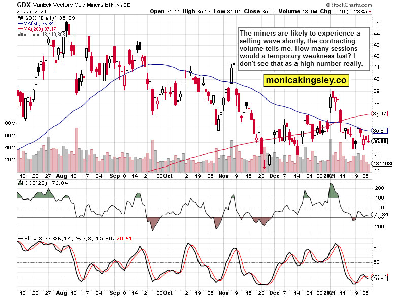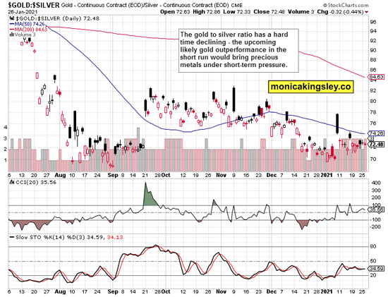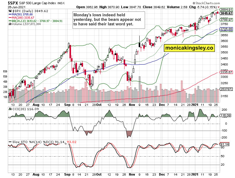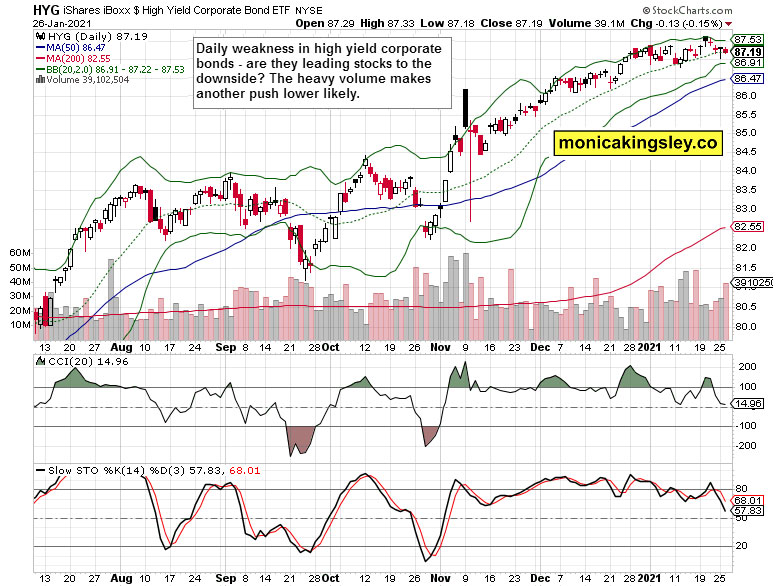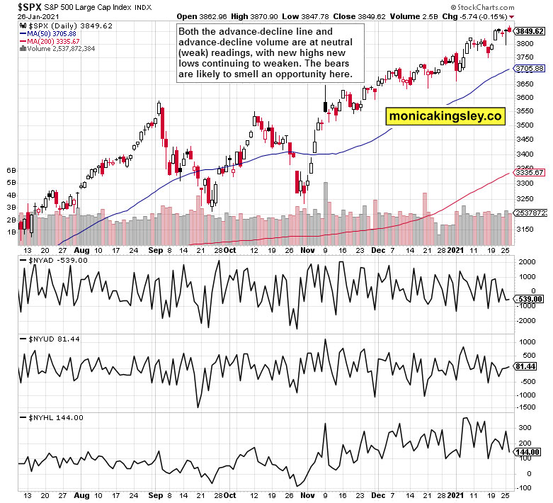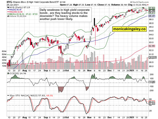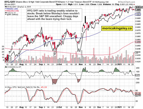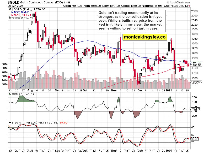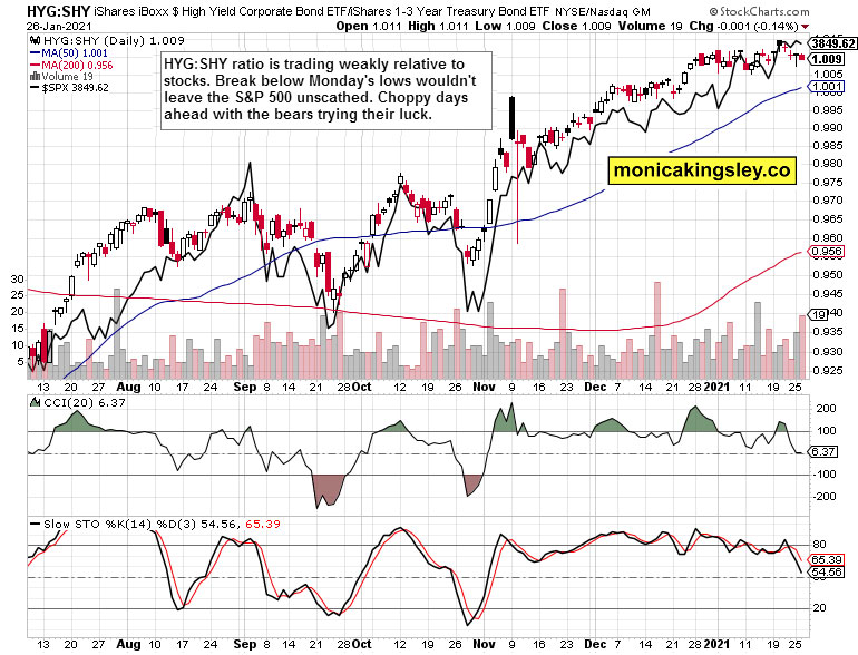 S&P 500 and Gold Bulls, Get Ready to Meet the BearsMonica Kingsley Yesterday‘s recovery ended on a weak note as stock bulls gave up the opening gap. Disappointing in the very short run, especially given that other key markets acted likewise weak. Neither corporate bonds, nor gold, nor oil could get their act together, and are hanging in the balance. Inviting the bears to probe the defences, how far south will they be able to get? We have the Fed meeting later today, and while I am not looking for hawkish surprises or any outright optimism, the investors aren‘t taking chances. Sell now, ask questions later seem to be the mantra before the U.S. open. While Monday‘s hanging man candlestick predictably didn‘t bring follow through selling on Tuesday, I am looking for the bulls to get tested today. Once the dust clears, we can go on making new highs, but the short-term storm (storm in a teacup, more precisely) hasn‘t started yet. In today‘s article, I‘ll examine the S&P 500 standing, look into precious metals, and finally answer a pointed question about gold. Let‘s start (charts courtesy of www.stockcharts.com). S&P 500 Outlook Stocks are hanging in the short-term balance following yesterday‘s weak close. Unconvincing volume, inviting a premarket push to the low 3800s as we speak. The aftermath of the Fed will set the tone for the coming sessions, but I would look for early credit market clues before buying any dip. Credit Markets High yield corporate bonds (HYG ETF) had a weak day yesterday, missing the opportunity to rise. Quite to the contrary, they traded relatively weaker than the S&P 500 did. Any time corporate bonds start underperforming stocks, I am watching closely, and often from the sidelines. Investment grade corporate bonds (LQD ETF) closed about unchanged while Treasuries paused and didn‘t really advance compared to Monday. They appear waiting for the Fed, unwilling to move before discounting possible hawkish surprise (positive assessment of the economy would do that trick) as a false alarm. The ratio of high yield corporate bonds against short-term Treasuries (HYG:SHY) with the S&P 500 overlaid (black line) shows the very short-term vulnerability in stocks. How low will these go as the greed sentiment gets taken down a notch? You see, yesterday I did strike an optimistic tone in the runup to the regular session‘s open, but the bulls missed a good opportunity to act, and the resultant signals favor the bears to step in now. That‘s the essence of my trading style – neither a permabull, nor a permabear, and always ready to turn on a dime should the facts change. The market breadth indicators show we‘re on the doorstep of a push lower. Instead of holding ground, new high new lows solidly declined, while both the advance decline line and advance decline volume muddled through. That‘s not exactly a bullish constellation. Precious Metals in Focus Gold also appears to be acting a bit weak in the short run. No surprise as I don‘t see the lengthy consolidation as quite over yet. This one will more likely wear you out than scare you out. Simply put, the gold bulls better wait for spring to usher in another precious metals upleg as the miners to gold ($HUI:$GOLD) ratio isn‘t sending any kind of confirmation that the sector has made a turn. The gold to silver ratio keeps treading water, and isn‘t declining below its early September lows. On the other hand, it‘s not trading too far from them either, which translates into silver not acting at its weakest exactly. That‘s a bullish sign, showing that this 5-month long consolidation is really getting long in the tooth. Completing the picture, miners (GDX ETF) reveal lackluster short-term performance. Long upper knot and volume as low as could have been, mean that we better brace ourselves for a down session today. From the Readers‘ Mailbag Q: Hi Monica, congratulations and best wishes on your new venture and I look forward to following your work. I'm an English working class boy, now very Grey who follows the gold market like a hawk. I'm a longterm investor in PM's sector and I have a largish position in PM miners (still in profit on most) but the last six month are playing havoc with my nerves. The best metaphor I have that describes my current situation is that I have a large bowl of golden soup with a big fly swimming in it and its name is Mr Radomski. His latest missive of 25 Jan outlines "where to now Gold" with a possible/probable decline of gold to between $1500 - $1600. I was rather hoping you might comment on his analysis and on how you see things developing over the coming months. I appreciate that you don't give financial advice but his very bearish view is discomforting given the mad world we have around us and if Gold could crash to these levels in the current situation it begs the question why bother investing in PM's. A: Thank you for the question and for authorizing me to print it just the way it arrived. I‘ll answer solely from my personal perspective, and won‘t comment on personalities. I understand your frustration with gold being unable to really move, but as I tweeted already yesterday, this months-long correction is one to wear you out, not to scare you out. Please check my Aug 07 article written for Sunshine Profits called S&P 500 Bulls Meet Non-Farm Payrolls, where in the section Calling out gold, I discuss the yellow metal‘s prospects. Compare that with my Monday‘s article Rosy February for S&P 500? Not So Fast to see how things turned out in the sector precisely. It‘s with the same conviction that I say today again that this long consolidation in gold is in its latter stages. For now, gold is still rangebound, and I don‘t see a deflationary crash repeating that would bring it to said $1,500 - $1,600 levels. Definitely not. Looking at the real world around us, the Fed is becoming more active in expanding its balance sheet, new stimulus checks are coming (money flowing 