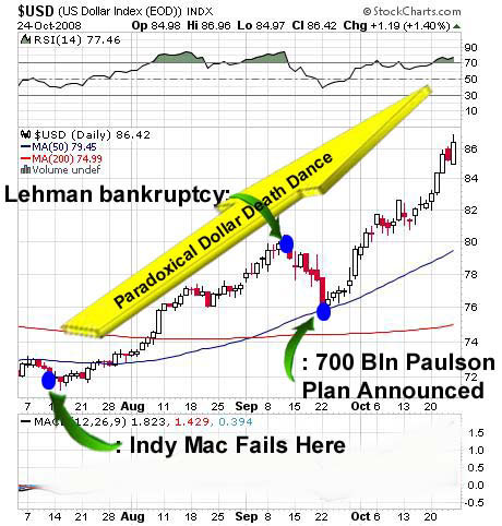 If we look at the fundamental-defying, recent meteoric rise in the U.S. Dollar Index, we can trace its roots to systemic institutional failure brought on by the mortgage-backed-security led implosion of the OTC derivatives complex first signified by the demise of mortgage lender Indy Mac: ![]() What folks need to understand is that the global OTC derivatives market - measured in tens or hundreds of Trillions - is virtually all U.S. Dollar denominated. Its SYSTEMIC failure - which is now occurring - requires U.S. Dollar balances to clear [settle] the trades [bets]. This has created the paradoxical global demand for U.S. Dollars - the currency of a country that is fundamentally bankrupt. By rationing credit to hedge funds that were naturally levered and "long commodities" [institutions like J.P. Morgan routinely took the other sides of their customers commodities bets, ruining institutions like Nat. Gas player Amaranth] - and propping up the balance sheets of those who were "short commodities" - the Banks - the Federal Reserve led cabal of Central Bankers have ENGINEERED the collapse in commodities prices while creating the illusion that market commentator, Dr. Jim Willie, so aptly described as The USDollar Death Dance. The engineered collapse of the commodities complex became necessary in the eyes of monetary elites because the rush for tangibles and corresponding repudiation of fiat money was becoming manic - as so CLEARLY evidenced by the emerging shortages of precious metals, gold and silver bullion. Caught In Their Own Lies If the Fed / Treasury wanted to ensure that banks would actually lend any of this freshly-created-out-of-thin-air money, they WOULD NOT have undertaken the dramatic round of issuance of CASH MANAGEMENT BILLS - giving banks and financial institutions the sovereign surety offered by Treasuries. In the absence of these Cash Management Bills, idle cash would have "piled up" on banks balance sheets - forcing them to behave like commercial banks are supposed to, lending to corporate customers. Details of CASH MANAGEMENT BILL AUCTIONS [pdf] [$ DRAINS] in Oct,, 2008: