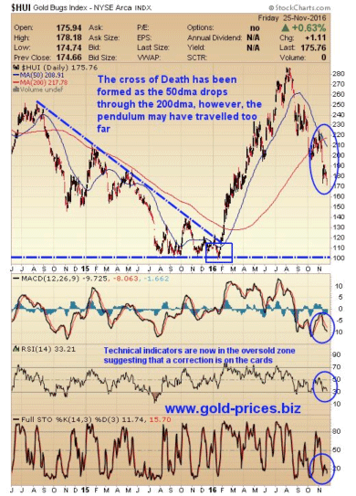 The Carnage in the Gold Sector Could Be OverBob Kirtley Background The gold and silver producers made a blistering start to the year; however, the second half of the year has been a totally different story. The chart below depicts the rise and fall of the gold producers which make up the Gold Bugs Index the HUI. This Index has now fallen 60% from its recent high of 282 which suggests to us that the selling pressure should be just about exhausted. Overall the HUI remains some 72.2% off its high (630-175) made in 2011, so there is plenty of room for the stocks to rise once gold resumes its bull market. (Click on image to enlarge) The chart shows that a Cross of Death has been formed as the 50dma penetrates the 200dma in a downward motion which is usually interpreted as more negative action to follow. However, this is not always the case as a lot of damage has already been done prior to the formation of this crossover. We can also see that the technical indicators are now in the oversold zone suggesting that a correction is on the cards. There are a myriad of reasons for the volatile behavior in the precious metals sector and this post can’t cover all of them but hopefully will reflect some of the reasons that we view as important. Factors to Consider We start with India, one of the world's biggest importers of gold with annual demand of up to 1,000 tons. It is alleged that some of it is paid for with black money which has attracted the attention of the Tax Department. The authorities have now withdrawn higher denomination notes, in order to disrupt cash funded gold smuggling. This looks to be a bit more than just saber rattling so we will monitor the situation as it develops, but I doubt that gold imports will be banned completely. We do need to be aware that a lot of governments are desperate for cash and these actions could form part of the answer to their problems. On the other hand the threat of a ban may well cause a surge in buying, just as gun sales went up whenever President Obama talked about new controls. The US election has produced a maverick in the form of President-elect Donald Trump. The markets would appear to believe his election promise of re-building the infrastructure as the dollar has surged as investment funds flow through into the stock market. The DOW has now surpassed the 19000 mark to register a new all-time high, maybe in readiness for a Trump generated economic boom. All of these new projects will require funding so sooner or later the printing press will need to swirl even faster than it does now, which in turn will dilute the value of the dollar. At the moment the technical indicators for the dollar; MACD, RSI and the STO are all in the overbought zone, so it should take a breather shortly, which may help gold to get off the ropes. Monetary policy still casts its shadow of the precious metals sector with the next meeting of the FOMC scheduled for 13/14th of December 2016 when the markets expect to see a rate hike, so it almost baked into the cake. A rate hike isn’t good for gold as the dollars inverse relationship with gold tells us that when the dollar goes up, gold goes down. However, the important thing to look for is the narrative by Janet Yellen in the Feds press conference. If this is perceived to be of a softer tone, then it may be some time before we get another rate hike thus allowing gold to move to higher ground. This could be the turning point for gold and act as an ignition for the resumption of the gold bull market. The price of gold as we write is approximately $1178/oz which is about $200/oz lower than its June peak of $1375/oz. The RSI is down to 20.63 which is the lowest it has been for some time. A reading below the ‘30’ level is usually considered to be oversold so we can see that gold is extremely oversold and a bounce from here is not impossible. Conclusion The US Dollar is not the ‘Dead Cat’ just yet as many of the other major currencies look to be in worse shape thus investors have a preference for the dollar. The rally in precious metals has corrected hard which is not all that unusual for any bull market. The wall of worry will still need to be climbed as the volatility ramps up and the oscillations become even wilder than they have been recently. We have just witnessed the political norm being shattered with Brexit and the Trump victory. This is symptomatic of the general feeling that all is not well and the whiff of revolution is in the air. The next political shoe to fall could be France where their current president is one of the most unpopular of all time. Alain Juppé has conceded defeat to François Fillon in the rightwing primary. Fillon is considered by many to be similar to Margaret Thatcher in that he has promised to shrink the French state. He still has to beat Marine Le Pen who is convinced that the same resentment which saw the Brits reject the EU could sweep her to power, as unlikely as this may seem. As this distrust gains momentum the populous will look to protect their own wealth and the establishment does not endear itself to them hence alternative forms of protection will be sort and precious metals sector will be in that frame. Some of our readers will be aware that we acquired both gold and silver some years ago and today our main focus is on the mining stocks. Our position is that we are firmly in the camp that believes that a long-term gold bull market is now unfolding. The volatility that we have experienced is about to go on steroids as the intensity of this white knuckle ride goes into overdrive. We have increased our long positions in the precious metals sector to 70% with the other 30% in dollars. Volatility can be your friend and we used it starting about seven years ago through a number of well thoughtout option trades. During this period we generated a profit of 1358% as you can see from the trading record. As always, go gently and only deploy small amounts of capital into each trade as a we