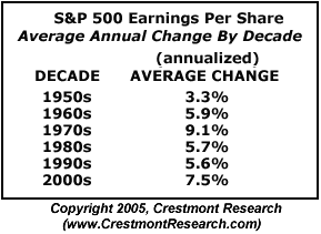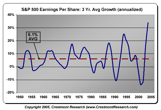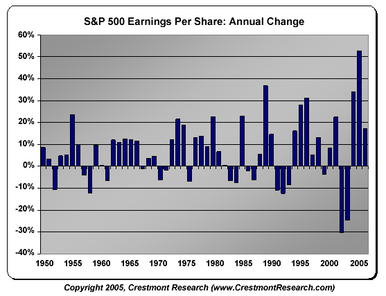 What type of returns can we expect from the stock market? Do I think we are still in a secular bear market, even as the market tries to make new highs? What causes long term market cycles? Is there a psychological component to them? (Answer: yes.) And can we make any predictions about the future of the stock market? All this and more in this week's letter. Last week we started a series on the debate between GaveKal and Bill Bonner on whether "It's different this time," centering on whether trade deficits matter. I said I was going to address this topic for the next few weeks. However, that was before major jet lag and time crunches caught up with me in London. If I wrote anything too detailed, I might have to disavow it on Monday. So, we will take up the debate next week, hopefully with a fresher and rested mind. But in the spirit of that theme, my good friend Ed Easterling of Crestmont Research sent me the following essay on why earnings are likely to disappoint in the coming years. It brought to mind a study that I spoke about to the Value Investing Congress in New York City last Wednesday, which came from my book, Bull's Eye Investing. After Ed's piece, I am going to adapt that part of the book to address what Ed suggests is likely to happen. And speaking of books, Ed wrote a fabulous chapter in my new book, Just One Thing, called "Risk is Not a Knob." If you like his thinking below, you will really like that chapter. You can learn more about Just One Thing or buy it at your local bookstore or buy it direct at Amazon. And now to why stock market bulls hope it is different this time. Maybe It's Different This Time By Ed Easterling Based upon most forecasts of reported earnings from S&P 500 companies in 2006, the stock market is beginning to look attractive. Earnings per share ("EPS") have increased at double-digit growth rates over the past few years and are expected to tack on another strong leap in 2006. Yet the stock market is down for the first ten months of 2005 while hope abounds that a bull rally is near. Let's explore the lessons of history for insights about reasonable expectations for EPS over the next few years. Since EPS and the overall price earnings ratio ("P/E") can be multiplied to determine the price level of the stock market, a valid estimate of future EPS is essential to develop a realistic view about future market direction and investment strategy. Earnings Rollercoaster The average nominal growth rate for EPS since 1950 is approximately 6% per year. The growth rate prior to 1950 is similar, although many economists and financial market analysts prefer to focus on the past five decades or so due to the distortions from The Great Depression and other issues early in the last century. Fifty-five years of modern financial history provides a rich set of experiences to understand the impact of business and economic cycles on EPS. Average rarely happens: There are significant cycles and volatile swings in earnings that average to a growth rate of 6%. Figure 1 presents the annual increase or decline in EPS for each year since 1950. For more than half of the past 55 years, EPS has changed--up or down--by more than 10%. Therefore, double-digit growth rates or declines are more often the rule than the exception. Despite the sense by some analysts that a maturing economy should lead to more stable growth rates, economic conditions and accounting practices have caused recent swings to increase in magnitude. Figure 1 Annual Change in Earnings Per Share The graph reflects periods of rising and falling earnings, with each cycle containing a series of relatively short spurts and stalls. Rather than the relatively smooth growth rate that many investors expect, earnings grow for a few years at a pace that is well above the average and then slow or decline for a couple of years. The average leg of a cycle runs 2.4 years, with upswings lasting 3.2 years and downdrafts correcting in 1.6 years. For a smoother view of this jagged series, which has varied between one and five years, we can use a rolling average of the annualized change in EPS. This approach combines the impact of rising and falling periods and can highlight when EPS growth has become extended above the long-term trend line or when it has regressed below it. As discussed in Unexpected Returns: Understanding Secular Stock Market Cycles, corporate earnings tend to grow over time at a rate that is similar to gross domestic product ("GDP") growth. Yet the effects of business cycles and other economic factors cause earnings to be more volatile than the economy. Therefore, EPS essentially vacillates around a more stable trend line. Currently, as reported in the Financial Times on October 22, 2005 in the lead editorial, "Corporate profits are already at a record 10.9 per cent of gross domestic product in the US...it is hard to see how earnings can continue to grow so much faster than gross domestic product." Not only is it hard to see how profit growth will extend its current record levels, but also it is instructive to look at history to understand what may lie ahead. Figure 2 presents the average annualized rate of EPS growth over rolling three-year periods. The graph indicates that EPS has risen so significantly in the past three years that it is vulnerable to a reversal and, potentially, to a series of below-average or negative periods. Figure 2 Rolling 3-Year EPS Growth EPS has risen beyond the long-term trend line following a trough during the 2001 recession. As reflected in Figures 1 and 2, this has been a repeating pattern over the past five and one-half decades. As with all volatile series, the average always represents a mathematical average of above-average periods and below-average periods. In these instances, average is only a point around which actual EPS vacillates due to economic conditions and business cycles. At all times along the cycles, investors are bombarded with messages of hope from bull market pundits. In