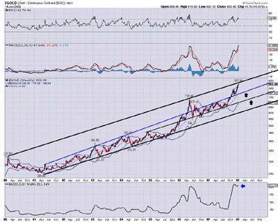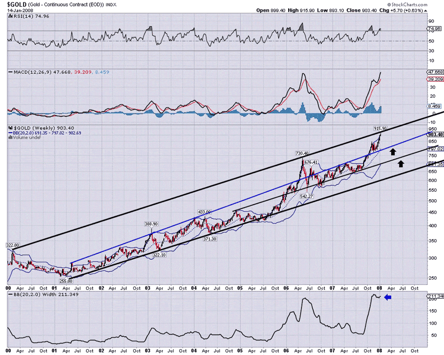 $900 Gold & 2008 OutlookJordan Roy-Byrne Not even a month into 2008 and gold is stealing all headlines again. The ancient metal of kings has hit an all time nominal high while many other markets have struggled since August. Can gold go higher from here? Is this a top? Below is a long-term weekly chart of the aforementioned metal. ![]() The various black trendlines all have the same slope and therefore form important channels. Gold has just hit long-term channel resistance. The Bollinger band width is very high, also implying a top could be at hand. The arrows show trendline support. The current risk outweighs the reward. Most curious has been the underperformance of gold stocks and specifically the juniors in the face of $900 gold. The HUI/GOLD ratio peaked when gold was trading around $420/oz. Gold has more than doubled since then yet the miners have underperformed. We can't give away the specifics here, as that would be unfair to those who bought our 2008 Market Outlook. However, we do think we have found several answers and in the outlook we show the charts that help us understand why gold stocks have underperformed. Moreover, we analyze the current state of these charts and what it means for gold stocks going forward. It is a 43-page report that also analyzes many more markets other than gold. It can be purchased by visiting our website. Shameless promotions aside, how do we see things now? We don't see the big crash and Depression that some expect in 2008. At least not yet. Having studied economics and markets for a long time, we find that things often take more time to play out than anticipated. While there is great turmoil in the markets now we feel things will improve by the end of the year. The US is too important to the global economy to be neglected. Someday soon that will change, but not in 2008. We continue to like the precious metals and expect gold to finish the year higher than it started. Its path will be interesting and volatile but ultimately up. We have a different view on the energy sector in 2008 than most. Most important, 2008 should be a great year for traders but not for most buy and hold investors. Jordan Roy-Byrne |