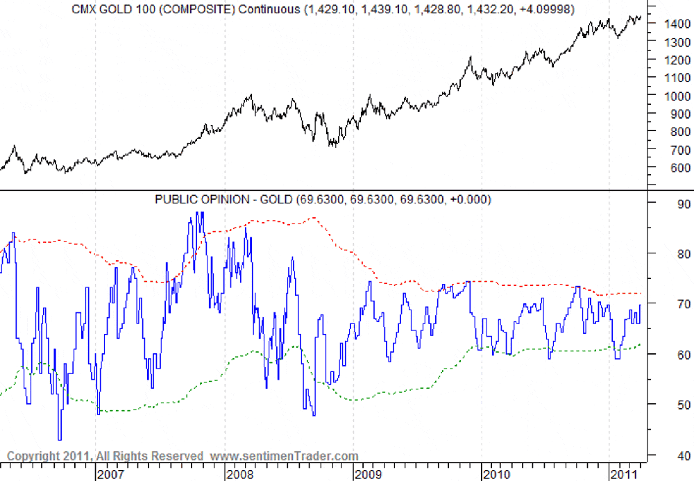 Gold at Record Highs, but Bullish Sentiment LagsJordan Roy-Byrne, CMT Over the past few weeks gold has traded at or near record highs. It has yet to embark on a sustained breakout but that is not because gold is a crowded trade. In recent months money has moved into equities, oil and silver. As a result, some hot money and speculative money has moved out of gold, leaving the market in a healthier state. The chart below shows the price, commercial short position and open interest. A high commercial short position typically coincides with a top in the market. Note that the commercial short position totalled 302K contracts at the very end of September. At the January low, the commercials were short less than 200K contracts. As of last Tuesday, the figure stood at 258K contracts which is well below the recent high of 302K contracts. Open interest has declined from 650K contracts in November to 509K contracts as of last Tuesday. timingcharts Sentimentrader.com’s public opinion gauge shows 69% bulls. Interestingly, since late 2008, public opinion has remained in a range from 60% to 73% bulls. Note that major peaks in 2006 and 2008 came near 85% bulls. If and when public opinion exceeds 75% bulls, then we’ll have an indication that some speculation is coming into the market. Sentiment by itself is not a timing tool unless it shows major extremes in either direction. Looking at sentiment data helps us decipher the near-term potential of a market. This data for gold tells us that the market is in a healthy position. Speculation in the futures market and speculation by the public are at reasonable if not even lower levels. This tells us that the market is in a position to rise in the near term (with an increase in speculation) and that the potential downside is somewhat limited. ### Jordan Roy-Byrne, CMT Jordan Roy-Byrne, CMT is the editor and publisher of The Daily Gold. Visit the newsletter page for information on his premium service. |