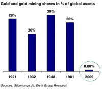 Gold and Gold Stocks are the Last Hope for MostJordan Roy-Byrne, CMT Tell this to a baby boomer or a middle aged person and they would be quite skeptical. Their neighborhood financial advisor or planner doesn’t advocate gold. It is too dangerous. It could drop to $500. Gold stocks? Hell no! After failing to get you out of stocks not once but twice in the last ten years, your advisor tells you its time to play it safe. You need to save more. As we should know by now, when it comes to the capital markets, conventional advice is eventually deadly. It identifies trends too late and fails to warn when risk increases and reward diminishes. However, most people would rather feel more comfortable than be a contrarian. Most people are too weak minded to find the answers, which usually oppose the herd. Look at the capital markets today and the trends are clear. With global growth likely to remain low to stagnant for quite some time, stocks and commodities will not help your portfolio. Treasury bonds are performing well but the threat of severe inflation and sovereign bankruptcy looms. Precious metals are the only winner, yet the herd doesn’t see it that way. To them, the bull market in precious metals isn’t even a bull market. It is an aberration. It is a mistake. The vast majority looks at the 1980s and 1990s as the norm. This is especially true of the financial industry. They don’t make any money from gold and silver so they don’t pay attention to it. It is only a nuisance. When will the financial media care about gold? The answer is when it can make money selling gold-related ads and products. It is interesting how much has changed. Fifty or sixty years ago you were supposed to have 10% invested in gold and that was regardless of market conditions. Today, the mainstream advisors and analysts that like and recommend gold, own less than 10%. They like it but they are afraid of it. It reminds me of a quote: The philosophies of one age have become the absurdities of the next. Most people look at the last 30 years as the norm, when the norm was the 170 years before that. Monetary systems are restructured several times per century. It’s nothing new. A monetary system without an anchor will ultimately fail. The greatest generation and their forefathers knew this and owned gold. It paid off in their time. Those with a long view of history know that the real risk is the current monetary system and not gold/silver. Every fiat currency in history has failed. Is it doom and gloom to expect the current monetary system to fail? No, its just prudence and foresight. Now that we’ve established this let’s refute the bubble calls. Because of the recent collapse in so many markets and industries (technology, internet, homebuilding, mortgage finance, banking, oil) investing professionals and the public are now quite wary of any market that rises materially. Most will miss the coming explosion in precious metals because they are too scared of an eventual collapse. Yet, they don’t even realize that precious metals are not even close to bubble territory. If precious metals were really in a bubble then please explain this chart to me: (Click on images to enlarge) As of last year gold and gold shares were 0.8% of global assets. If we are in a bubble then what was 1981? A volcano? And how are we in a bubble when the gold stocks have yet to breakout to new all time highs. (See the chart below). In fact, one of the best times to buy is when a market is on the cusp of a breakout to new all time highs. There are numerous examples of this in history. Moreover, gold stocks are still much closer to historic lows when compared to common stocks. See the chart below of the Barron’s Gold Mining Index against the S&P 500. It is highly probable that gold stocks will outperform common stocks over the next five years. Meanwhile, even though gold has outperformed stocks for 10 years, this chart suggests that outperformance has much more room to run. This is why one has to look at 100 years of history and not 10. The reality is that too many investors will continue to make terrible decisions either on their own or through a mainstream advisor. They are convinced that precious metals are risky. You can’t even get them to put 5-10% of their assets in precious metals. We are talking about the only bull market! This isn’t 2003-2007. Going forward, it is a near certainty that precious metals will outperform. Why? This is what happens in a major credit contraction. There is a run for real money. It doesn’t matter if there is hyperinflation or deflation. Since the crisis began we’ve had strengthening deflationary forces. Gold has advanced to a new all-time high and even higher against most currencies. Quality gold stocks have surged to all-time highs. Silver has outperformed nearly everything except gold. Amazingly, there is still time to get involved before the precious metals accelerate, leaving other markets in the dust. Looking to learn more? My publishers and I are hosting a CME-sponsored educational Webinar that will explain and educate on all things gold, silver and the mining stocks. It is completely free and you can sign up here. We also maintain a professional service, which helps guide traders and investors through this bull market. We offer a free, no risk 14-day trial, which gives you access to a month’s worth of updates! ### Jordan Roy-Byrne, CMT |