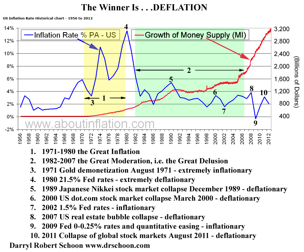 THE GREAT MODERATION i.e. THE GREAT DELUSION What you don't know explains what you don't understand In 1971, when the US ended the convertibility of the US dollar to gold, the only limit on the bankers' ability to print money ad infinitum-monetary gold reserves-was removed. This led to an immediate spike in inflation ending in an inflationary surge-from 3.3% in 1971 to 14.4% in 1980, a 436% increase. Economists called it the Great Inflation. Paul Volker, who along with Milton Friedman advised Nixon to cut the ties between the US dollar and gold in 1971, was forced as Fed chairman to end the inflationary surge by raising interest rates to a draconian 21.5 %, in 1980. After Volker's deflationary interest rate hike, inflation would not again be an issue despite the still expanding money supply. This anomalous absence of inflation would give rise to the erroneous conclusion that the Fed had somehow engineered a monetary miracle, a never-before-seen phenomenon where continuing money growth did not lead to inflation but to a period of relative stability that economists called the Great Moderation. The Great Moderation from the mid-1980s to 2007 was a welcome period of relative calm after the volatility of the Great Inflation. Under the chairmanships of Volcker (ending in 1987), Greenspan (1987-2006) and Bernanke (starting in 2006), inflation was low and relatively stable, while the period contained the longest economic expansion since World War II. Looking back, economists may differ on what roles were played by the different factors in contributing to the Great Moderation, but one thing is sure: Better monetary policy was key. http://www.federalreservehistory.org/Events/DetailView/65 'The Great Moderation' was, in fact, merely 'The Great Delusion'. The absence of inflation was not due to "better monetary policy", but to a series of cataclysmic deflationary events i.e. Volker's 21.5% interest rates followed by the collapse of massive speculative bubbles which unleashed powerful deflationary forces offsetting the inflationary rise in prices that would have otherwise occurred with excessive money printing. In 1971, global monetary aggregates, MO, totaled $8 billion; by January 2016, global MO totaled $80.9 trillion, an astounding increase of 1,000,000 %. Such an exponential growth of the global money supply would have either ended in extreme inflation or hyperinflation were it not for powerful contravening deflationary forces. After Volker's 21.5% deflationary interest rates in 1980, the next major deflationary event was the bursting of the Japanese stock bubble on December 31, 1989. The Japanese Nikkei fell from a high of 38,957 down to 7,607; its collapse awakening deflationary forces not seen since 1929 crash which caused the Great Depression of the 1930s. Today, Japan is still trapped in a moribund downward deflationary spiral. ...It has been over two decades since the popping of Japan's economic bubble and the country is still actively battling with deflationary forces that are so powerful that near-zero interest rates (zero-interest rate policy or ZIRP), repeated bouts of quantitative easing (some call it "money printing") and constant Yen-weakening currency interventions have barely made a dent. http://www.thebubblebubble.com/japan-bubble/ After the Nikkei's collapse, the US dot.com bubble burst in March 2000. Next, came the US real estate bubble whose collapse in 2007 lead to the Wall Street crisis of 2008; and, in August 2011, global markets plunged when the European sovereign debt crisis erupted. With each bursting bubble, demand collapsed and deflation gained additional momentum which central bankers attempted to overcome with more credit, more monetary stimulus, e.g. QE1, QE2,QE3, and more money printing; but despite central bank efforts to artificially induce inflation-indexed growth with monetary policy, deflation-capitalism's fatal wasting disease-triumphed. .