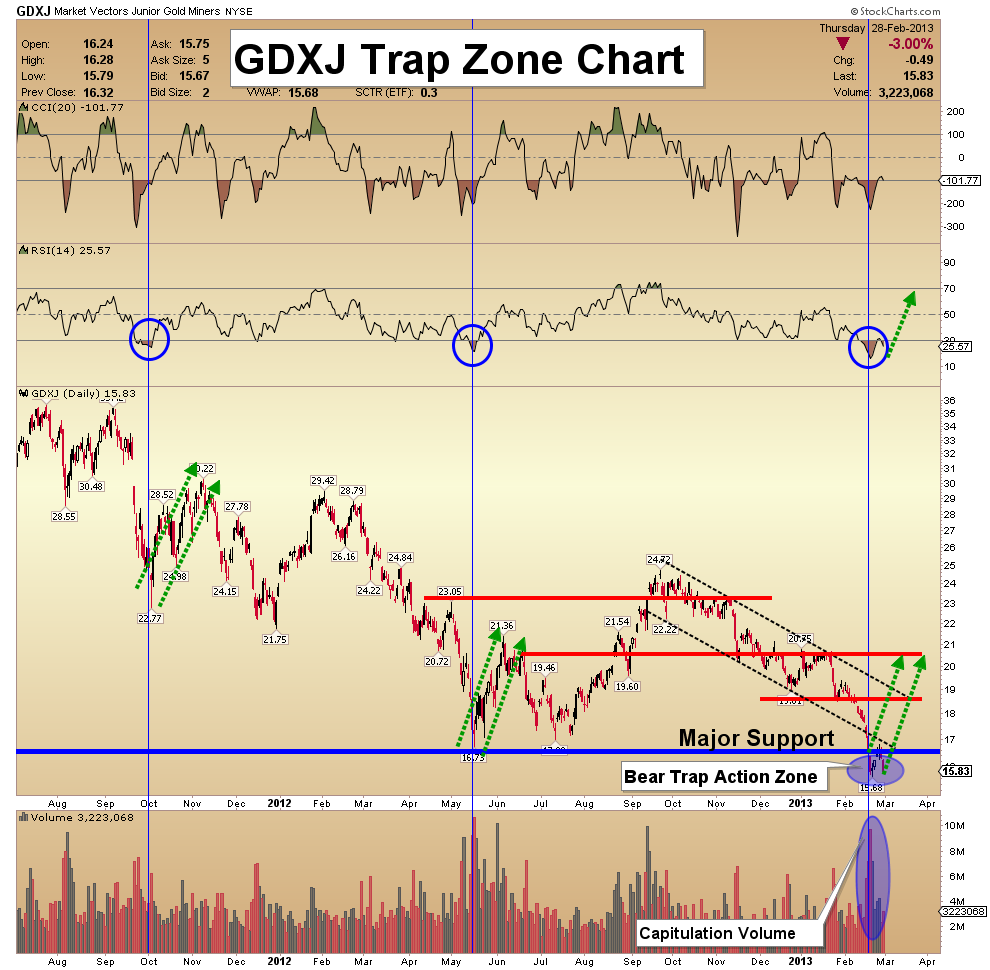 GDXJ Trap Zone Chart - Capitulation volume, a potential bear trap below major price support, and the superb position of most oscillators….suggests that a major bottom, or possibly a generational bottom, is forming in junior gold stocks.
