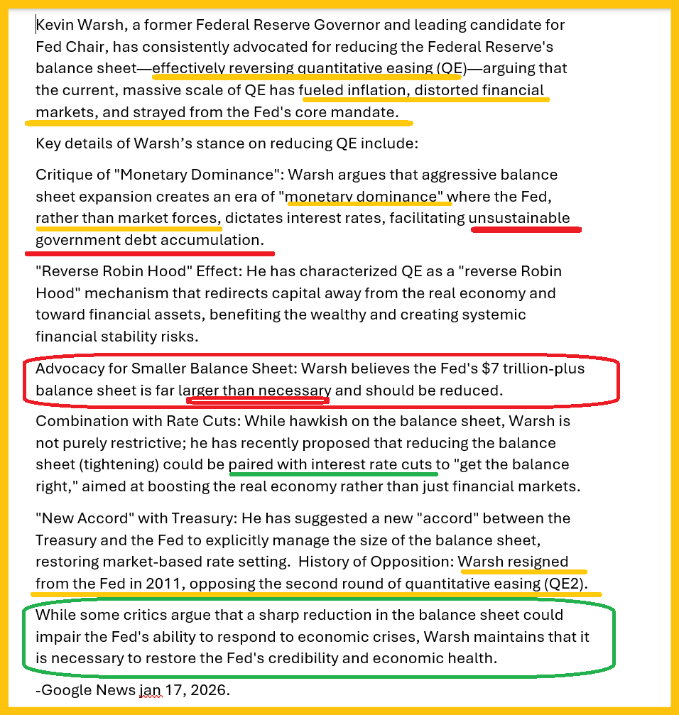 - Please click here now. The new Fed chair hasn’t been picked, but frontrunner Kevin favours QT (to infinity?) and views the stock markets as outrageously overvalued. He’ll need massive QT to restore any semblance of confidence in the US government, its bonds, and its fiat.