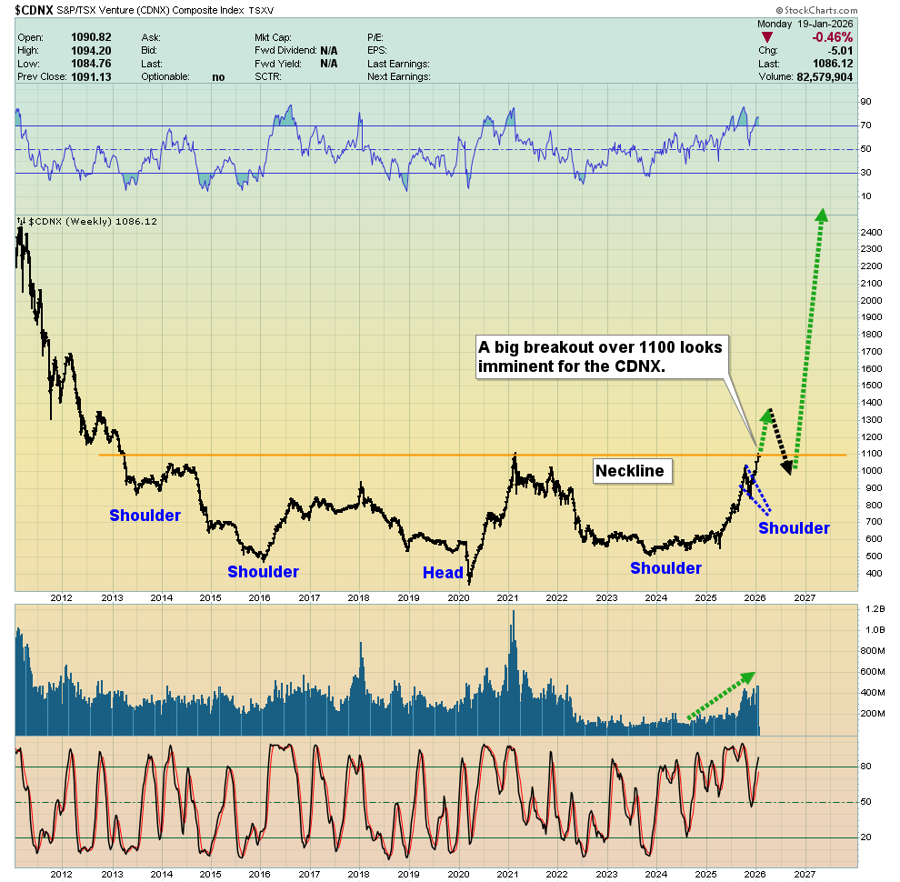 - Please click here now. Double-click to enlarge what I continue to view as one of the greatest base patterns in the history of markets, the CDNX inverse H&S pattern. I’ve suggested the breakout could accompanied by a long-term rates breakout and that prediction looks set to materialize in a magnificent way. My long-term target for the CDNX is 10,000 and many key juniors are almost certain to become “thousand baggers” even before that target is reached.