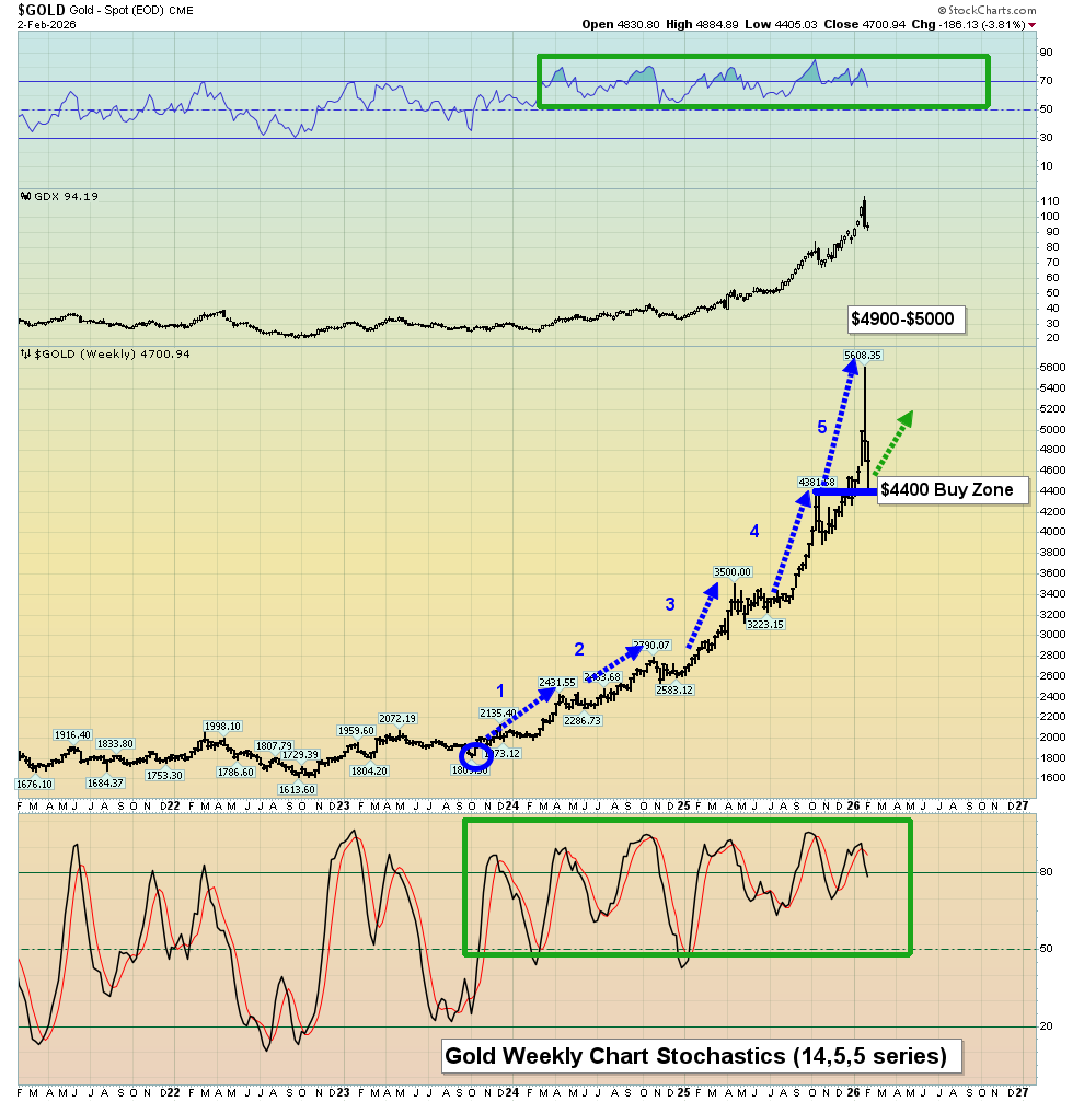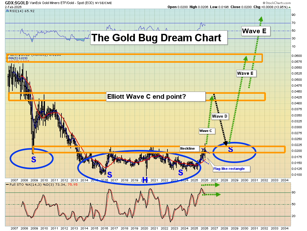 - While gold could range trade between $5600 and $4400 and silver between $120 and $70, GDX and most of its component stocks could surge to fresh highs! I’ve noted that 2026 is the Chinese year of the fire horse, which is associated with citizens taking bold action and fighting for freedom. Are gold and silver stocks set to get that same kind of bold action and freedom… the freedom to surge to incredible new heights? I’m going to suggest that they are!