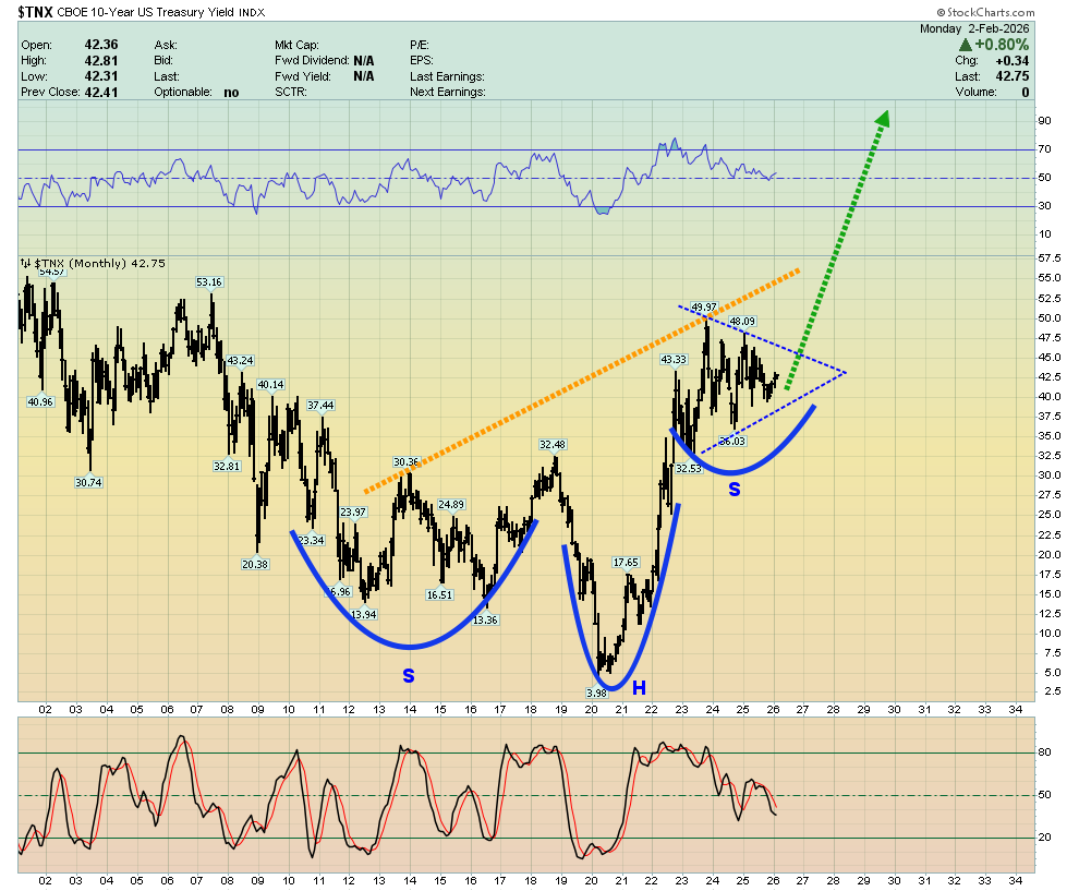 - For another look at US rates, please click here now. Double-click to enlarge. The new Fed boss is more likely to impose restrictive policy on the debt-crazed US government than hand out free QE candy bars and rate cut cake. That will affect the long-term rates of governments around the world, and global money managers will eagerly continue their savvy trek into gold!