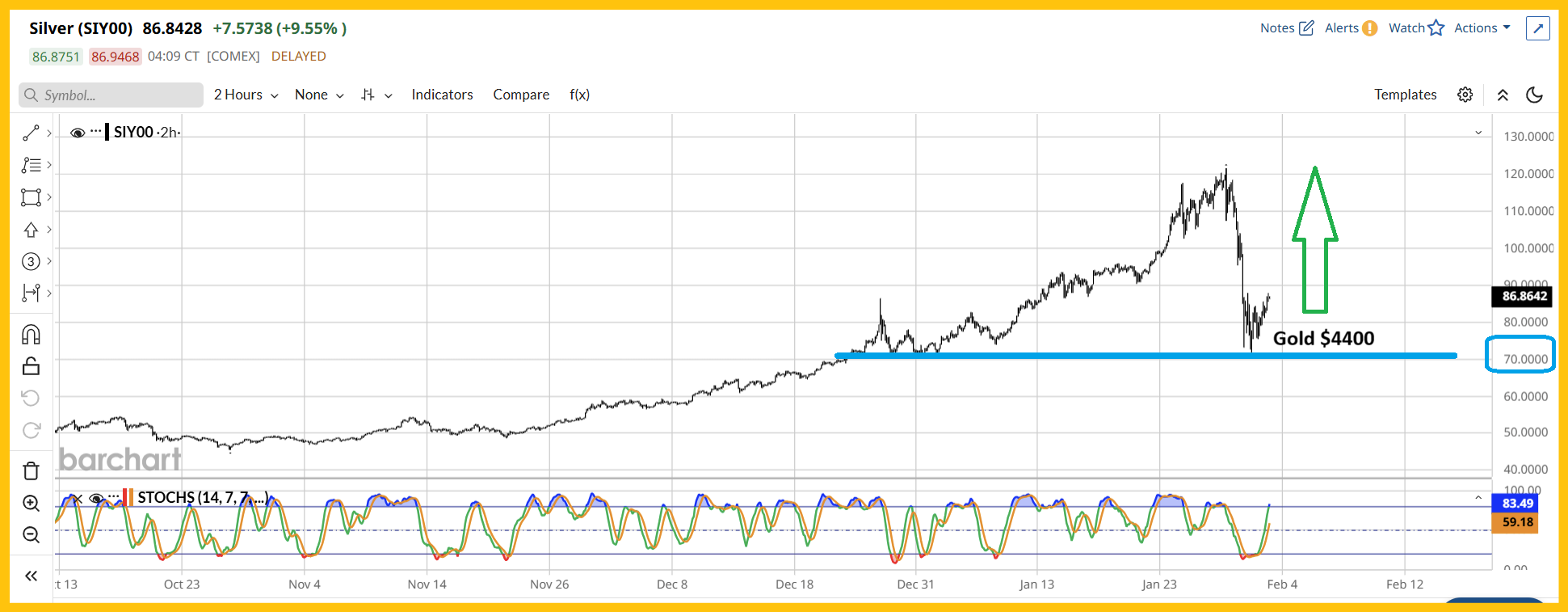 - What about silver? Well, please click here now. Double-click to enlarge. The silver price sale was “super sized” due to the large and highly leveraged bets against fiat, but it ended at the buy zone of $70, which is in perfect sync with gold arriving at $4400.