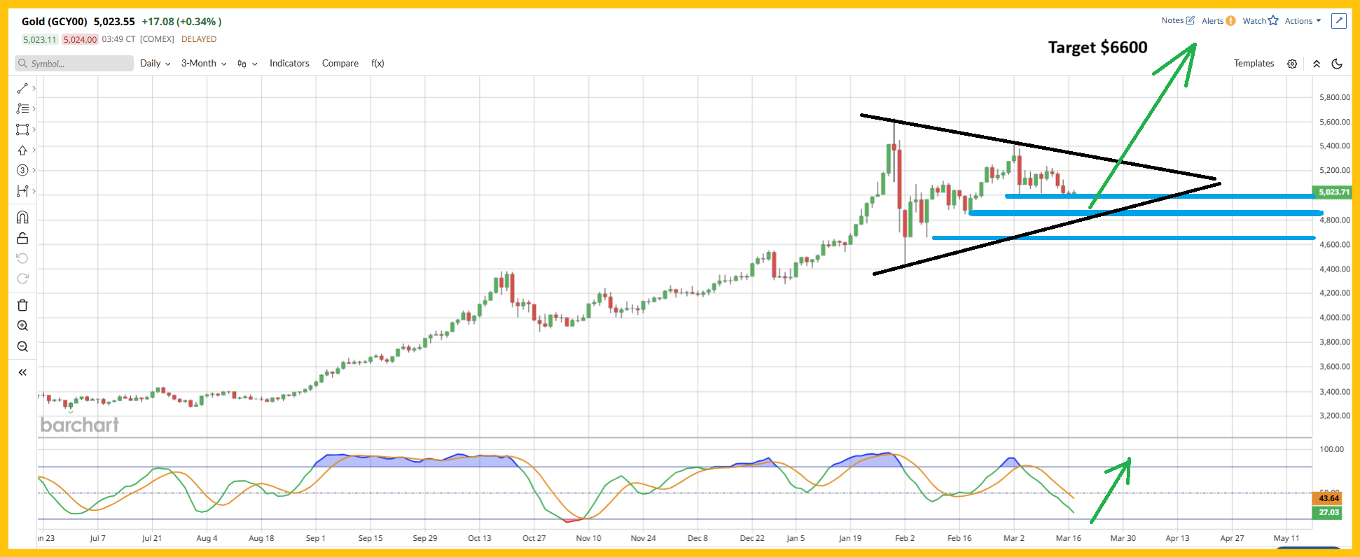 - Excitingly, Stochastics (14,7,7 series) is near a low, and if that low were to occur around $4850, a huge bull triangle would come to life! The triangle target would be about $6600.
