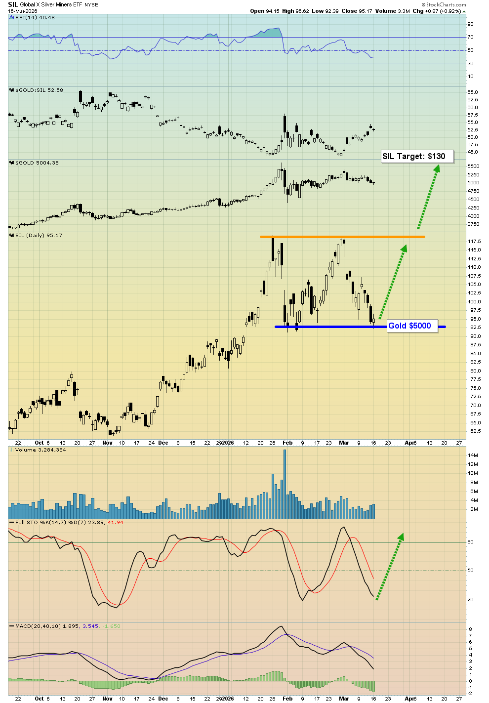 - Rather than trying to call a “final low”, my suggestion for investors is simply to identify great buy zones (like the current one) and buy modestly there. Gold $5000 correlates with about $92 for SIL. Additional stock (in GDX, SIL, and associated component stocks) can be bought at a gold price of $4850.