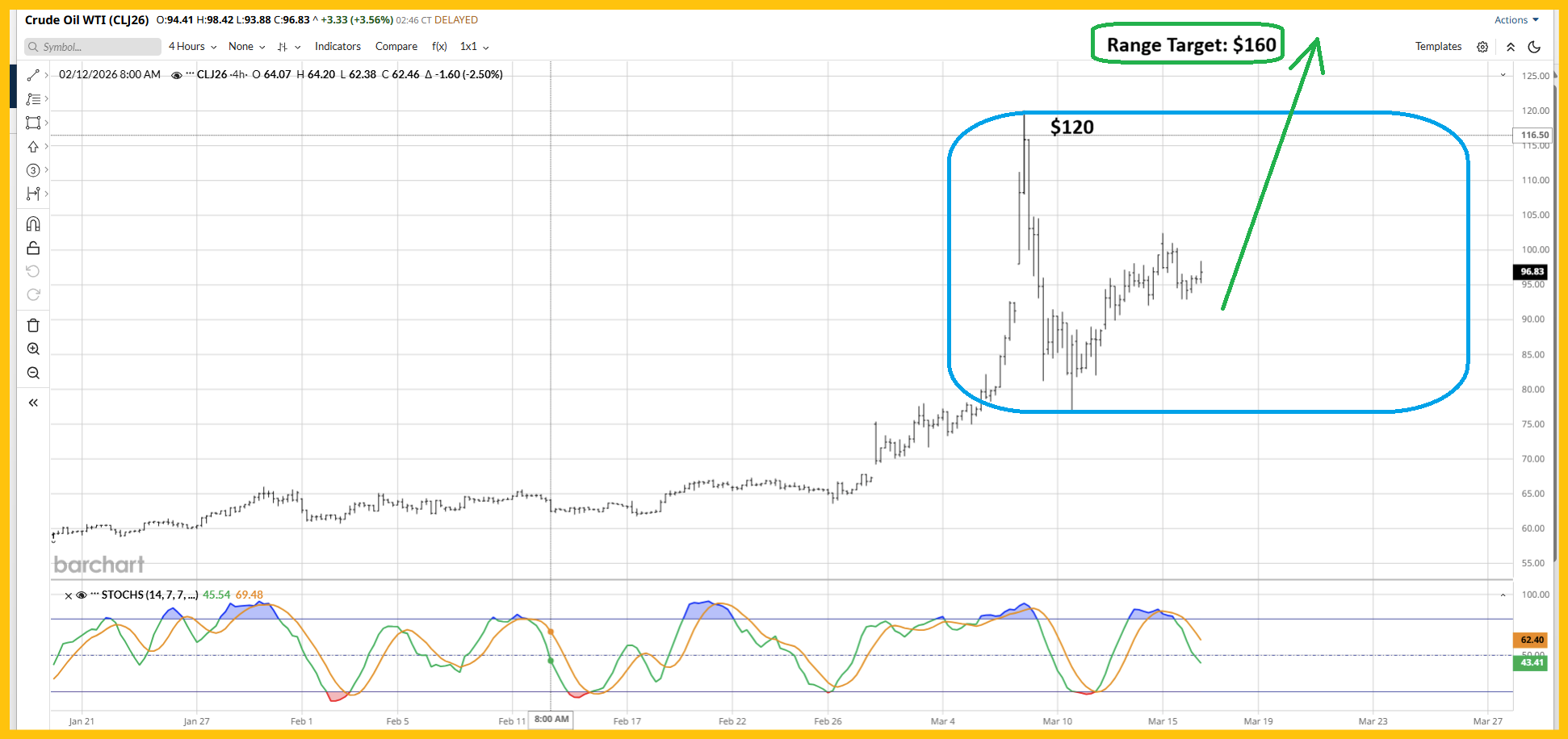 - That will launch my projected stock market rally (including gold stocks), but it appears that oil is in a big range trade between $80-$120… and odds favour the congestion pattern being resolved with an upside breakout and surge to $160. Here’s the bottom line: