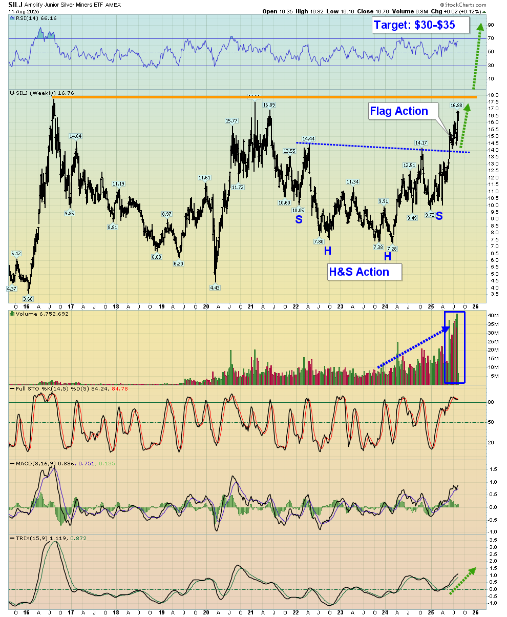 - For a look at the daily chart, please click here now. Double-click to enlarge. SILJ is pushing up from a broadening pattern. These formations indicate a loss of control in the market. Will this week’s CPI and PPI show a loss control, related to the tariffs? If so, will money managers surge into the miners, regardless of what happens to gold and silver? It’s likely to happen soon!