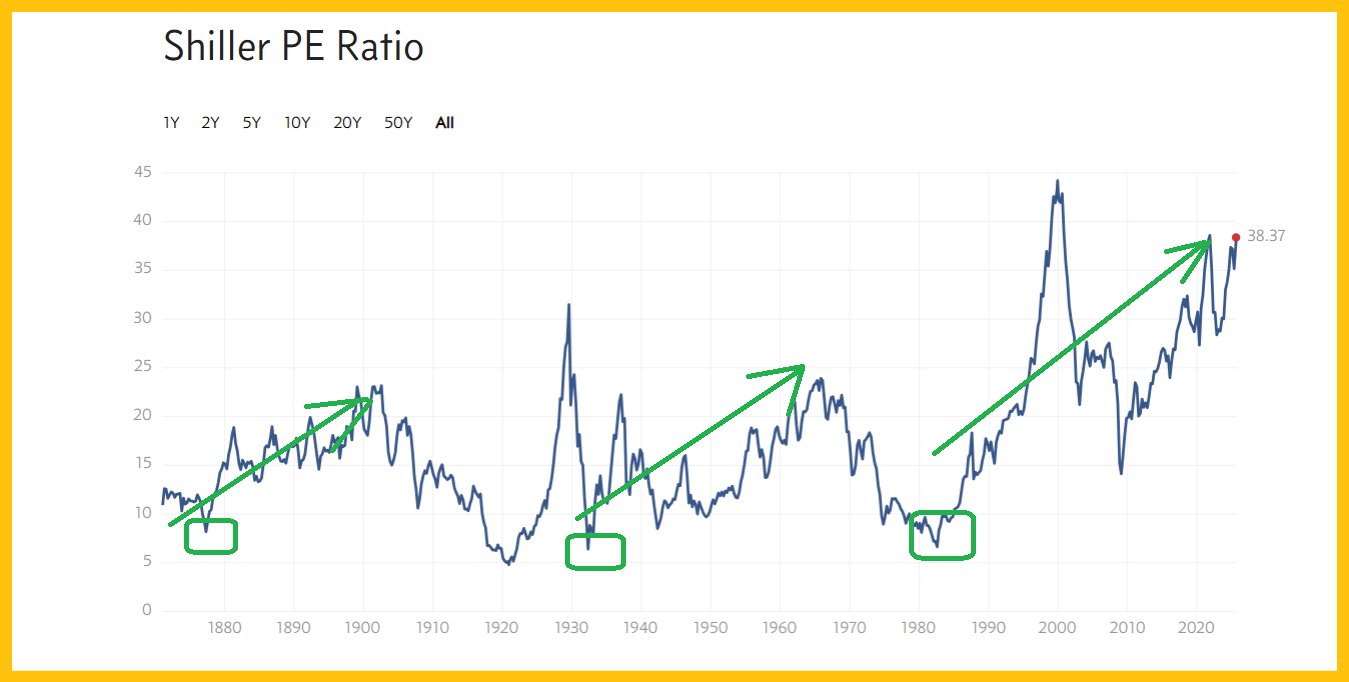- From those sub10 CAPE/Shiller great value zones, the US stock market advanced for multiple decades (before collapsing again).