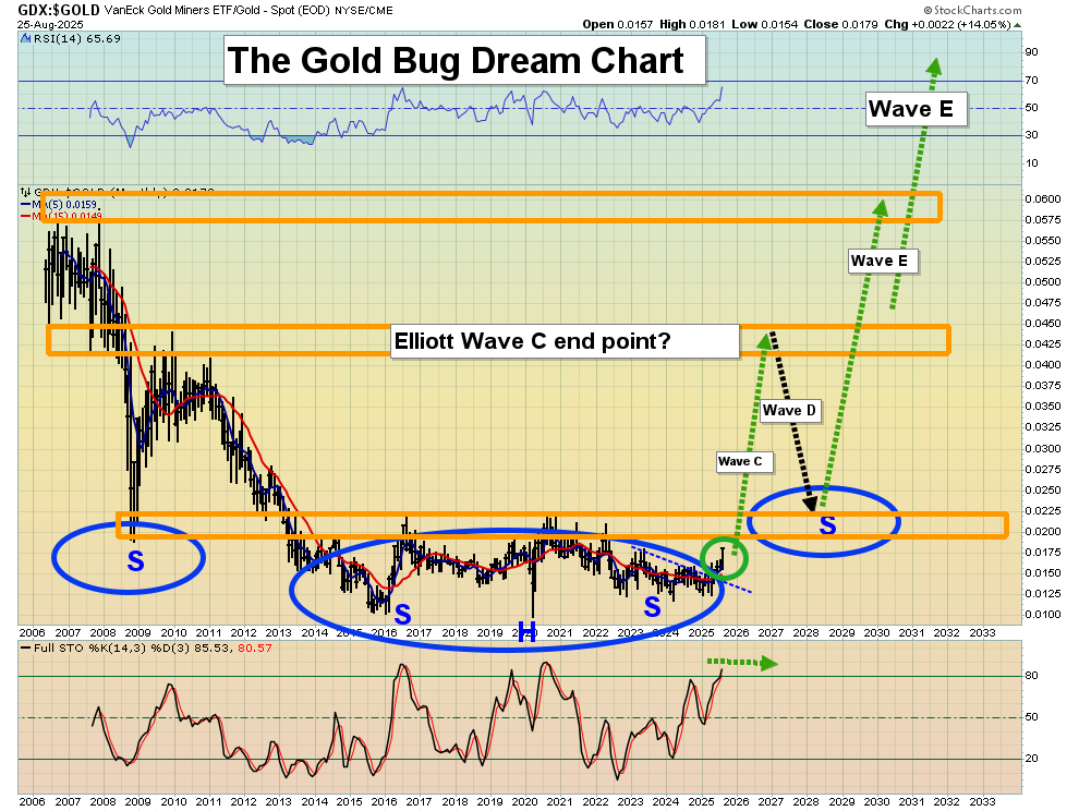 - Please click here now. Double-click to enlarge what I’ve dubbed one of the three or four greatest charts in the entire history of markets. It’s the long-term GDX versus gold chart. In 2014 I began highlighting the potential for the formation of this massive inverse H&S pattern… as the head began to form. Now, GDX is beginning to rise up from the head of the pattern. The rally to the possible neckline zone could see GDX trade above $100, and when Wave E is finally completed it could reach $200, $300, or even $500.