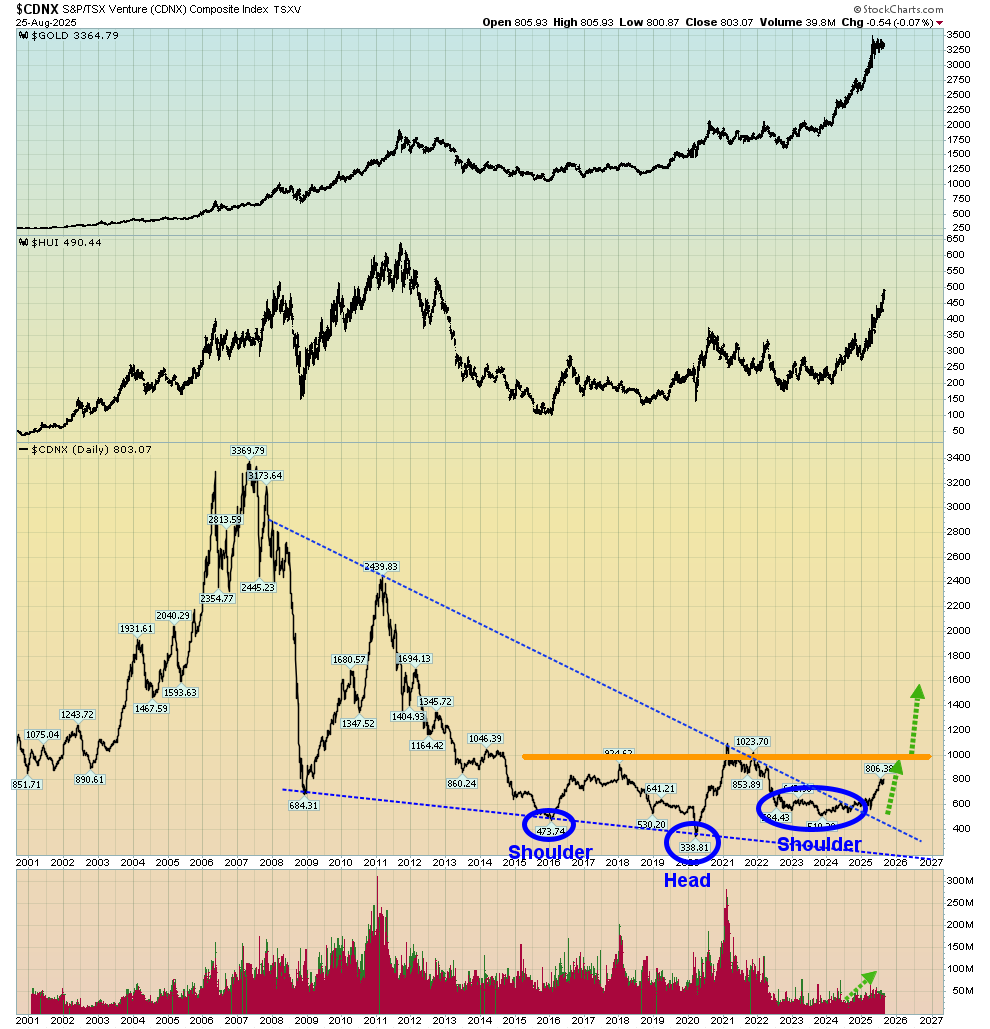 - They are pouring into the miners, and many of these great stocks are surging on big down days for gold. On that note, please click here now. Double-click to enlarge this enticing CDNX chart. A huge inverse H&S pattern is in play and the neckline sits at 1000. There’s also an even bigger loose bull wedge formation. It targets a move to at least the all-time highs. As the rally intensifies, investors can expect to see “ten baggers and more” become the norm for many if not most junior mining stocks.