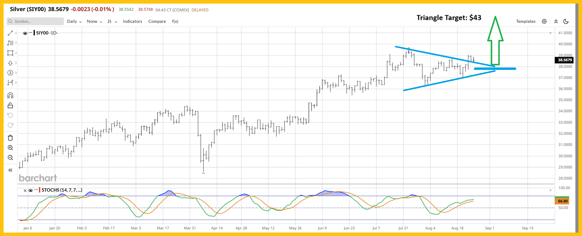 - What about silver? It’s also looking very good. To view the daily chart, please click here now. Double-click to enlarge. A key triangle pattern targets the $43 zone, and Friday’s wild action featured a very nice upside breakout.