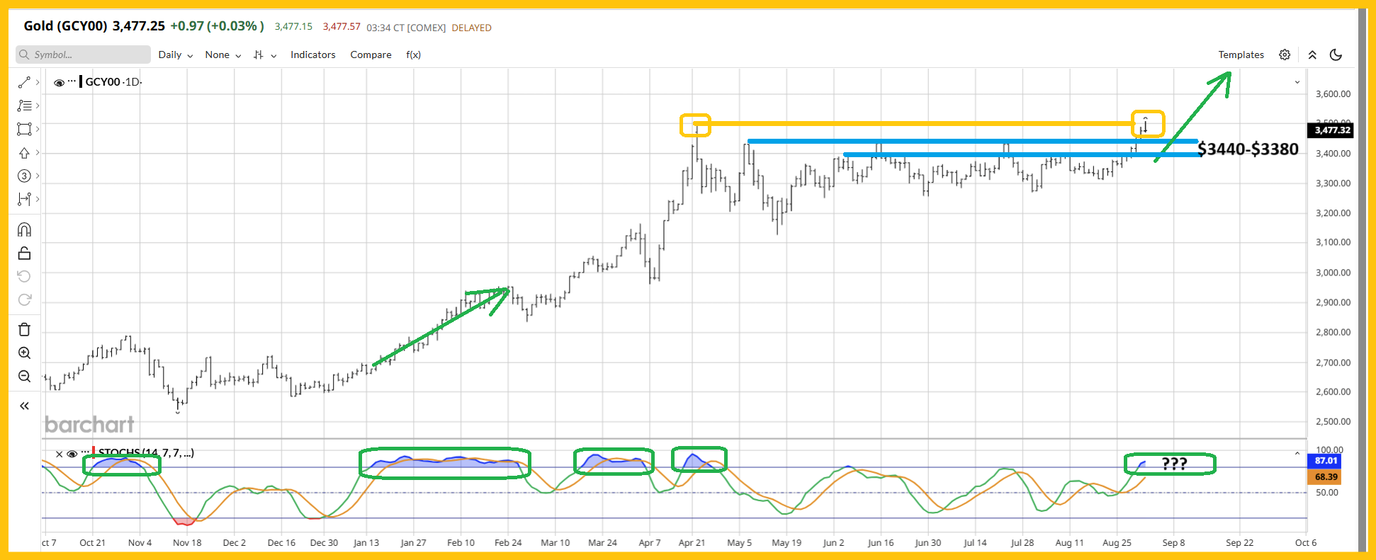 - Well, for some insight into this exciting matter, please click here now. Double-click to enlarge. What can be said is that the breakout above the key highs at $3440 is almost certainly real, but there is no real breakout above the “final” high of $3500… yet.