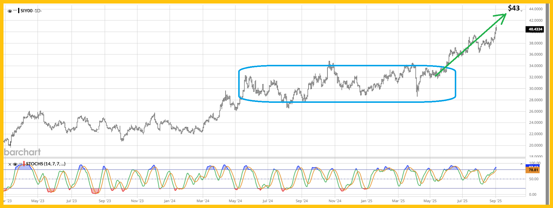 - What about silver? Well, please click here now. Double-click to enlarge. Silver’s upside breakout came months before that of gold… and it’s now the precious metals market leader. A charge towards $43, then the $50 highs is likely, and as noted, both an inflation cycle and a bull era are in play. Silver is likely to get immense investor respect for many decades to come.