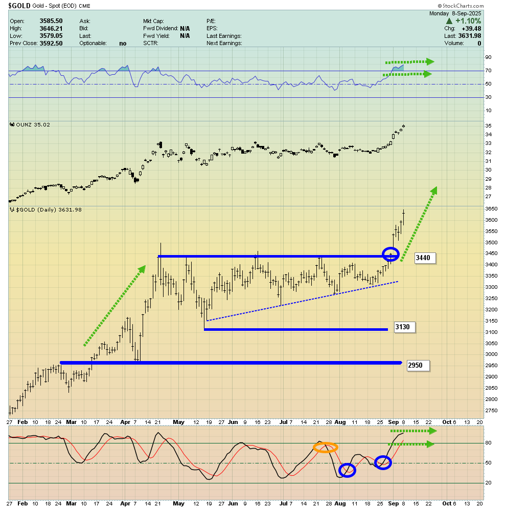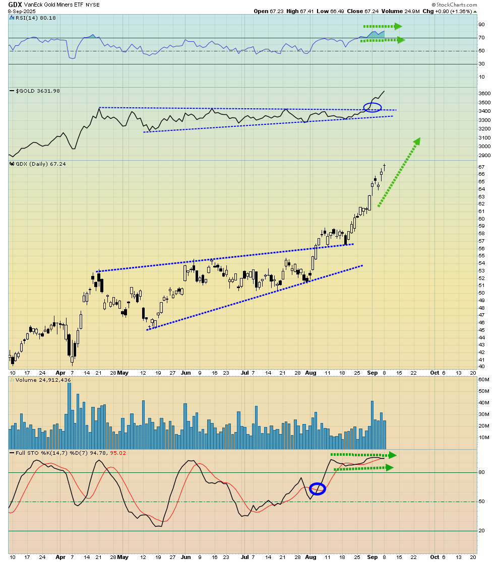 - Basis GDX, gold stocks hit an all-time high yesterday… and gold is powering up the charts again today!