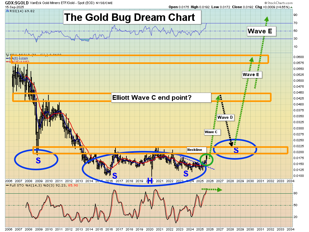 - Please click here now. Double-click to enlarge this fabulous GDX versus gold chart. Like the CDNX, GDX is arriving at the neckline zone of a truly epic inverse H&S pattern. While a pause is expected, what follows that pause is likely to be the most exciting rally in the history of mining stocks!