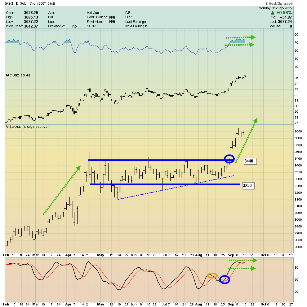 - For a look at the daily chart, please click here now. Double-click to enlarge. It’s normal for oscillators to stay overbought in a powerful market and that’s the case with gold right now.