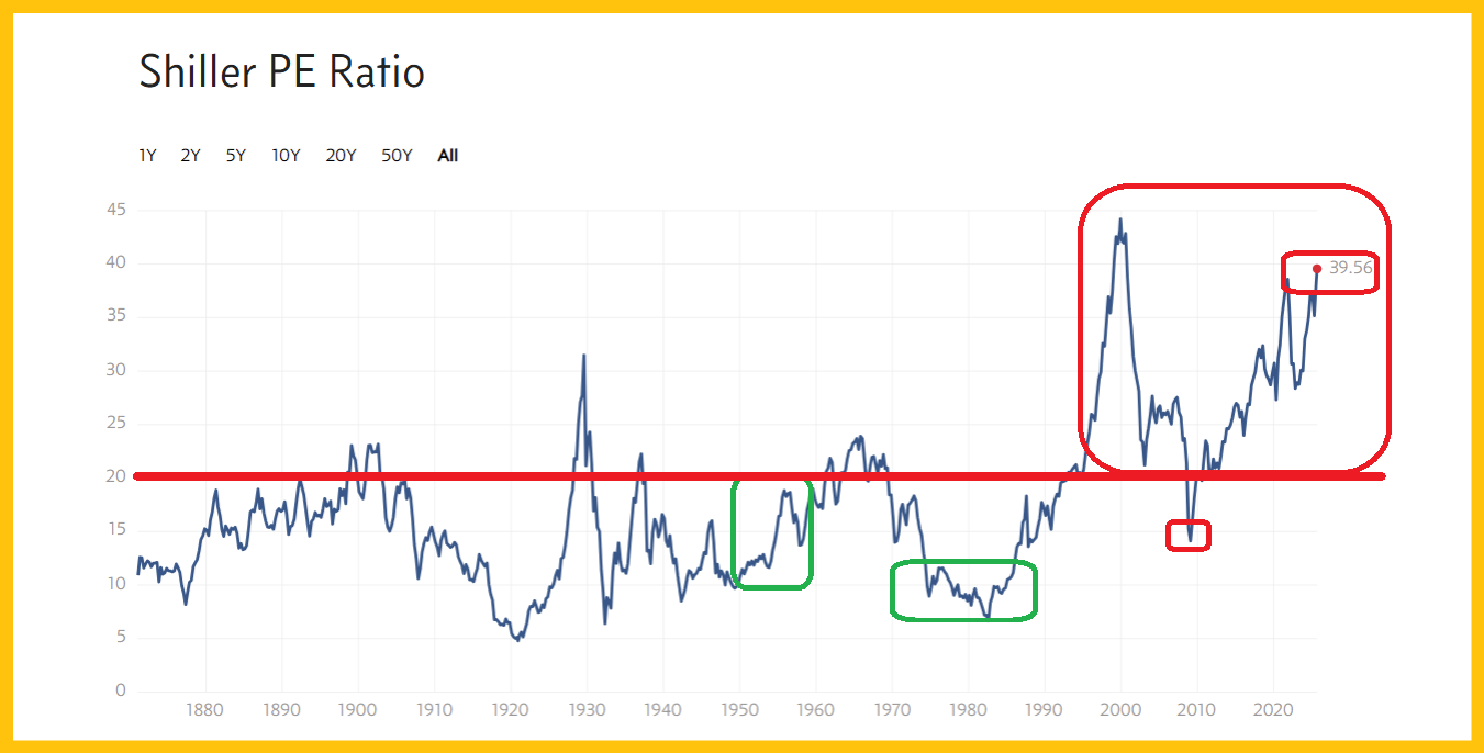 - Also, please click here now. Double-click to enlarge this disturbing SP500 Shiller/CAPE ratio chart. The ratio hasn’t been in the value zone (sub10) since the mid-1980s.