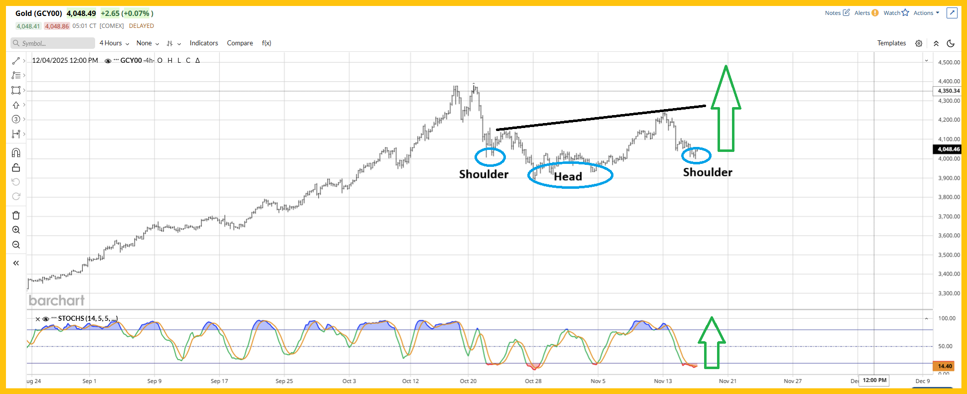 - For a closer look at supreme money gold versus inferior US fiat, please click here now. Double-click to enlarge. On this four-hour bar chart, Stochastics is much perkier and an inverse H&S pattern is in play.
