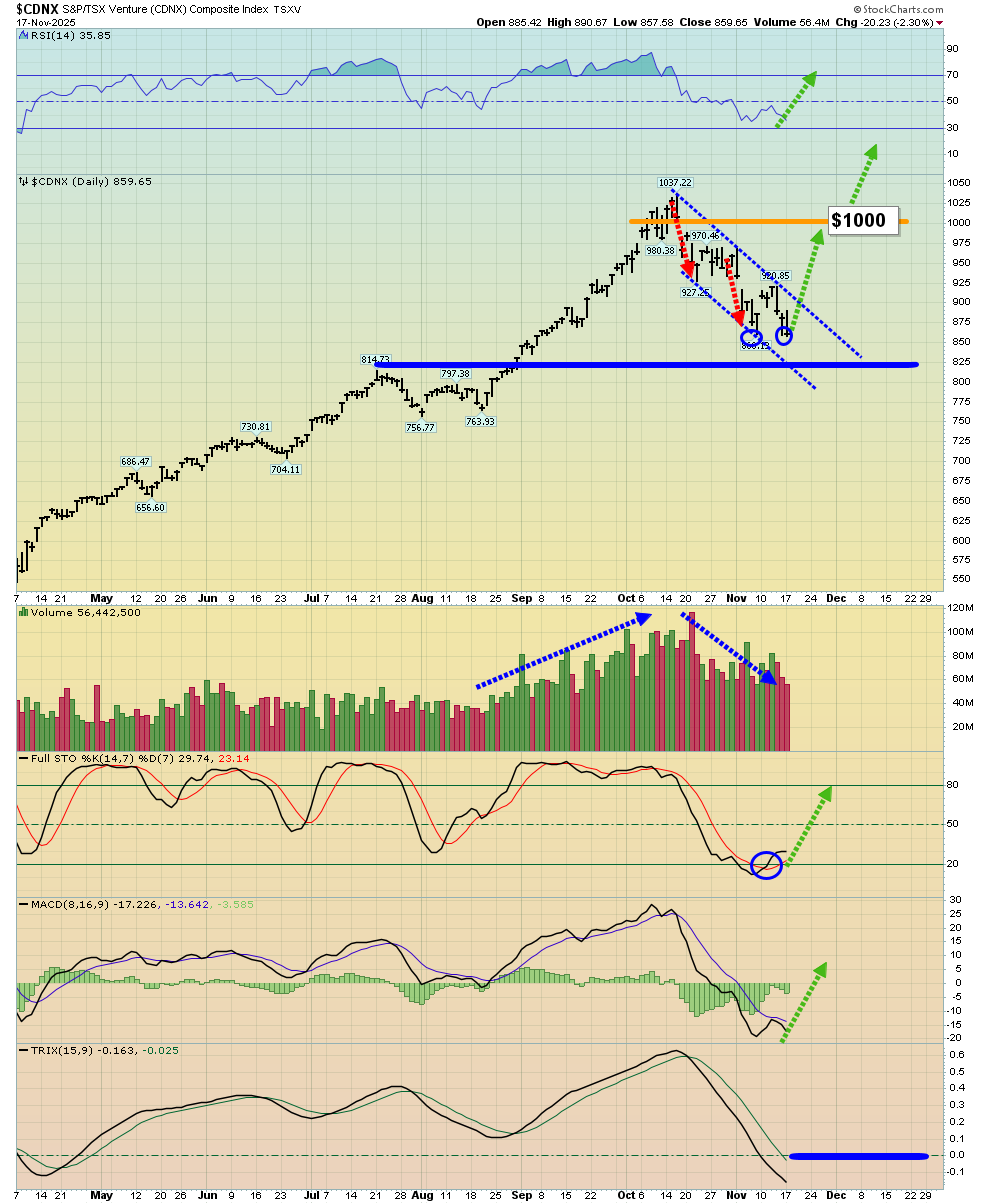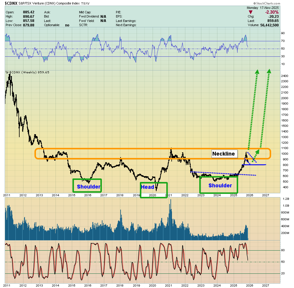 - Please click here now. Double-click to enlarge this weekly chart. Unlike the stock market, the CDNX pullback was expected to occur at the 900-1100 neckline zone of the huge H&S pattern… and it’s orderly.