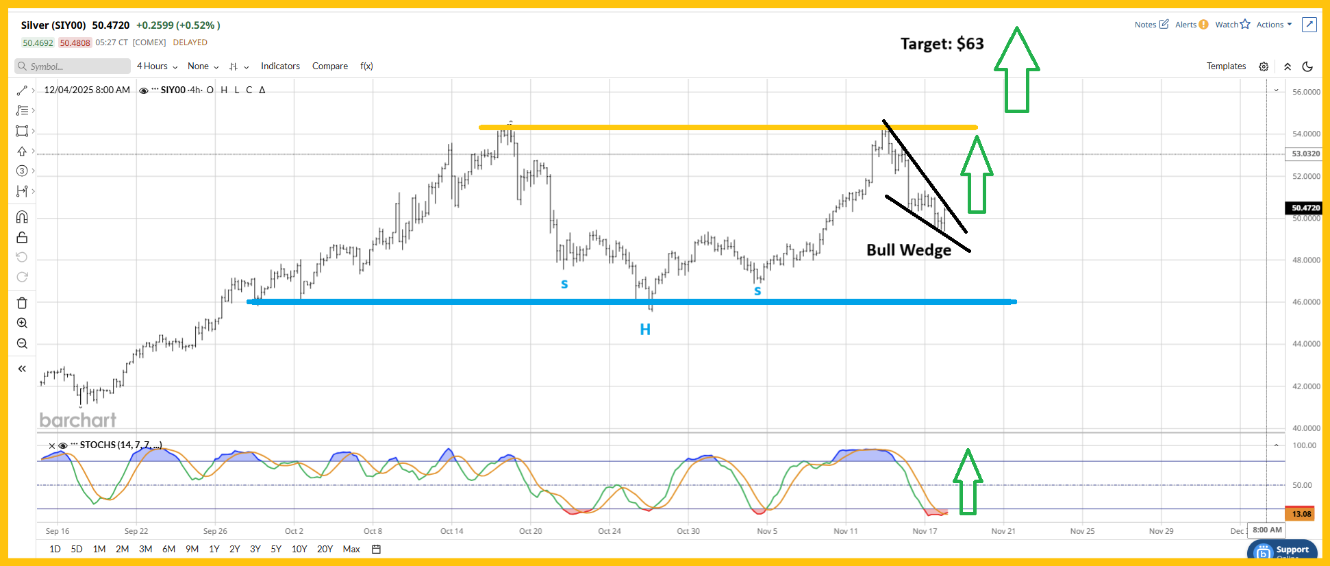 - For a look at silver, please click here now. Double-click to enlarge. Silver looks enticing. There’s a range trade between $46 and $54 with clear inverse H&S action in play. The bull wedge could mark the end of the consolidation and help launch a breakout above $54.