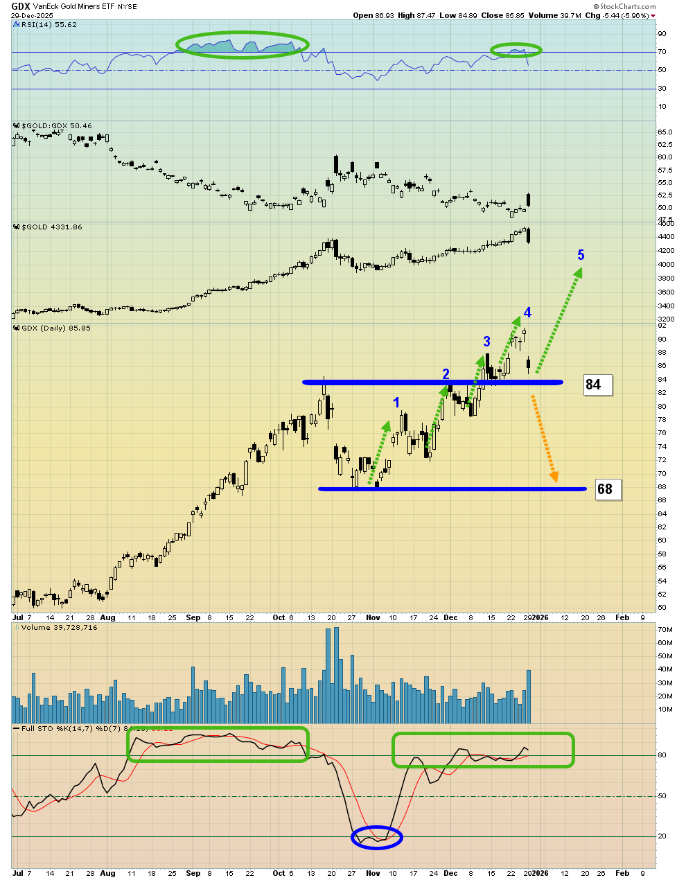 - For a look at the seniors, via GDX, please click here now. Double-click to enlarge this stunning daily chart. Rather than a “top”, there could a fifth minor wave higher… and it would be the biggest of the five, potentially taking GDX to $100!