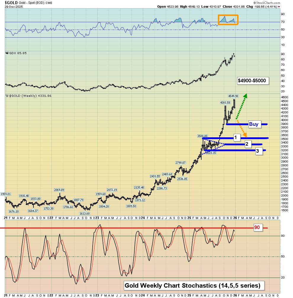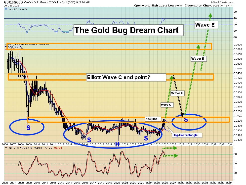 - Please click here now. Double-click to enlarge this phenomenal long-term chart of GDX versus gold. A flag-like drifting rectangle has appeared on the chart. When the breakout over the neckline does occur, investors need to be open to GDX hitting a fiat price of $200 and more. The bottom line: It’s going to be a golden 2026… especially for the miners!