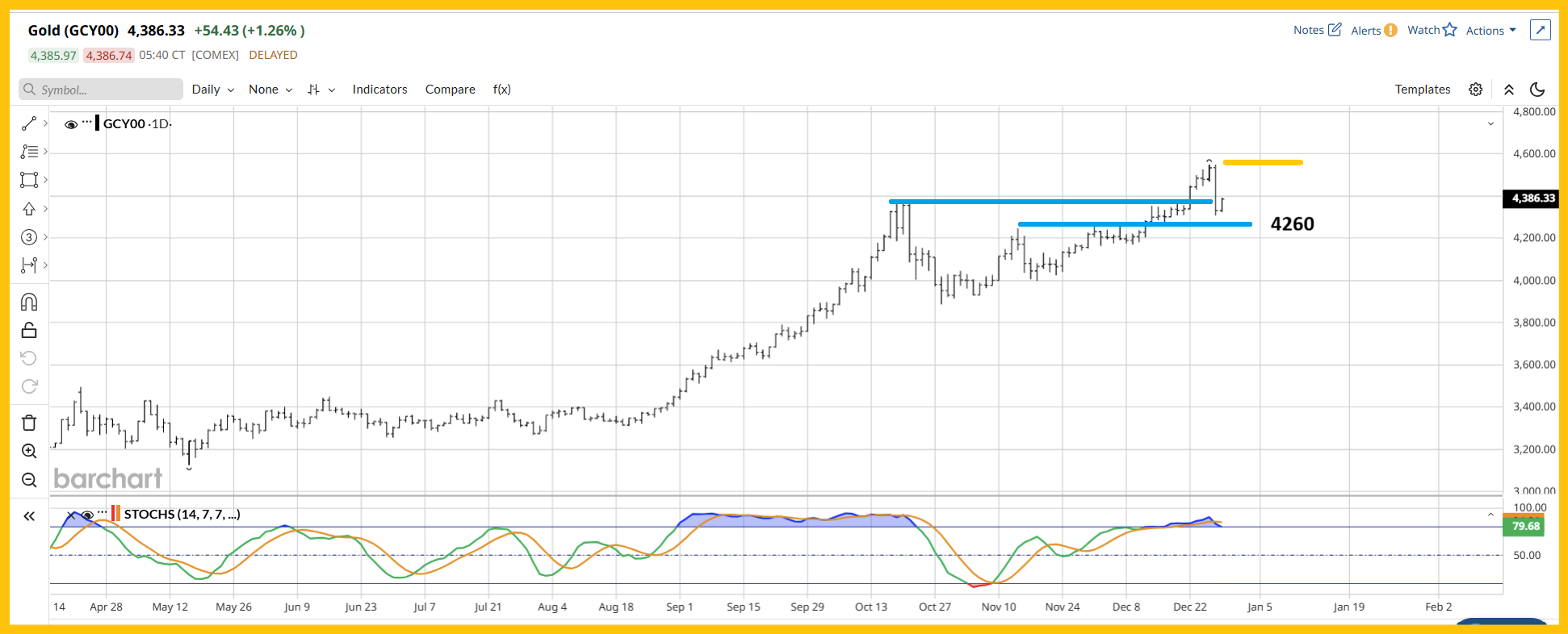 - For gold in the near term, there’s modest support around $4400, $4350, and $4260. It’s possible that all that’s happening now is a margin-induced shake-out.