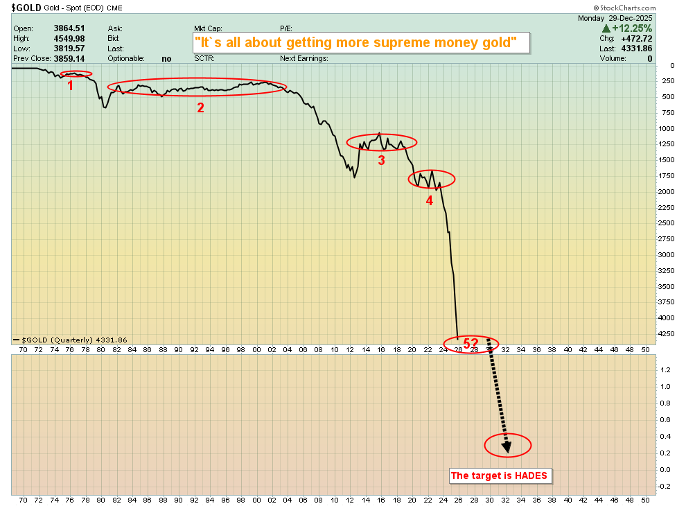 - Gold surged against fiat during the last hiking cycle, and it’s likely to surge even more this time… probably towards the $10,000 area.